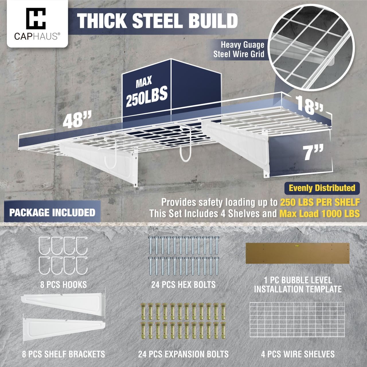- π¨ Various Size Choices - This option includes FOUR wall shelves, EIGHT Versatile hooks, and all necessary hardware. Each shelf measures 48 inches in width and 18 inches in depth, providing a total of 192 inches in width. Opt for the silver hex bolt for concrete and wooden walls and choose the golden expansion bolt for secure installation on brick walls. Heavy gauge steel construction provides safety loading up to 250lbs total per shelf, this set providing a total weight capacity of 1000 lbs.