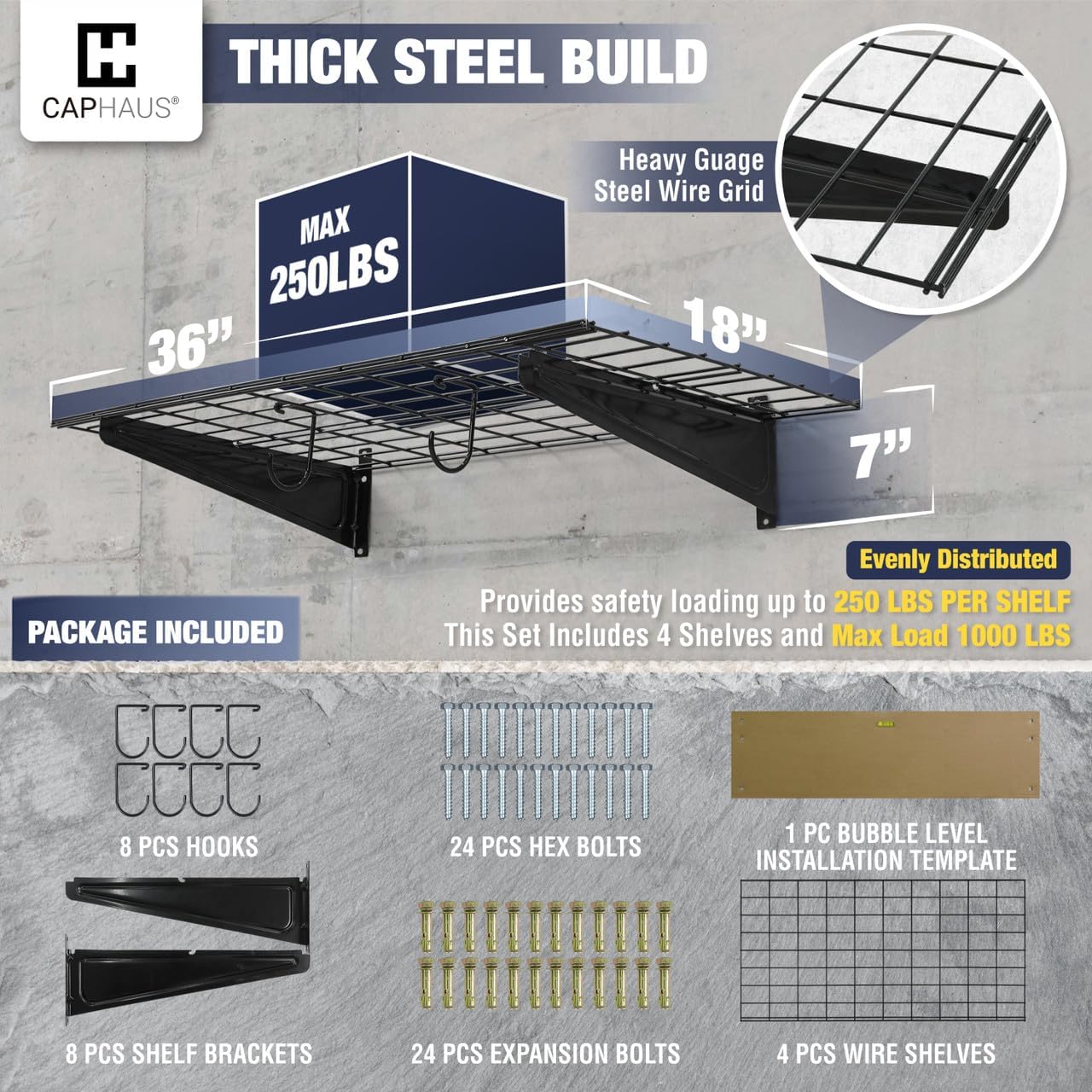 - π¨ Various Size Choices - This option includes FOUR wall shelves, EIGHT Versatile hooks, and all necessary hardware. Each shelf measures 36 inches in width and 18 inches in depth, providing a total of 144 inches in width. Opt for the silver hex bolt for concrete and wooden walls and choose the golden expansion bolt for secure installation on brick walls. Heavy gauge steel construction provides safety loading up to 250lbs total per shelf, this set providing a total weight capacity of 1000 lbs.