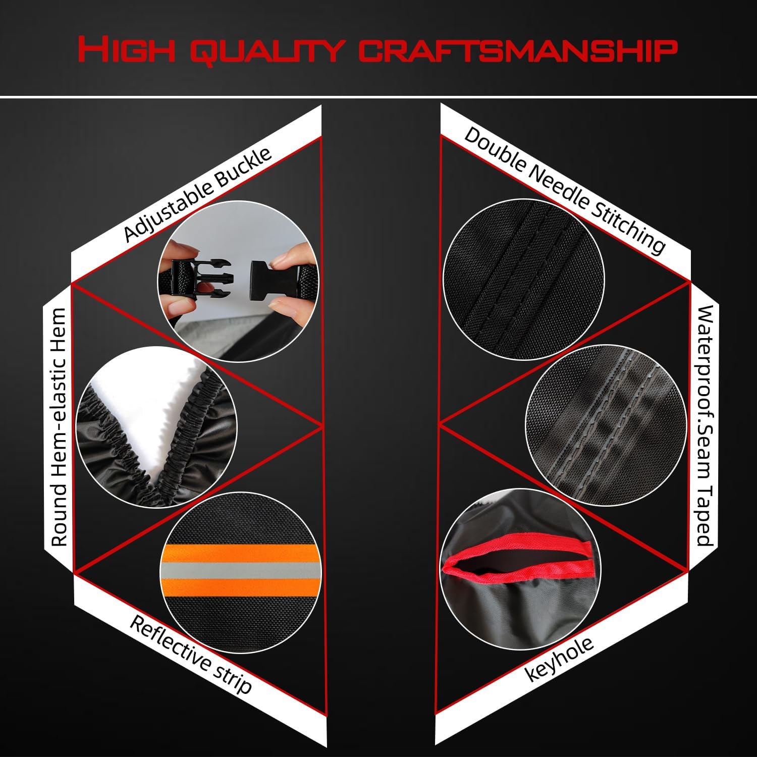 Motorcycle Cover, Heavy Duty 600D Oxford, Waterproof Outdoor, Weather Resistant, Rip-Proof, Anti-UV with 5 Reflective Strips, 2 Lock-Holes, 1 Windproof Strap, 1 Storage Bag (116" x 41" x 50")