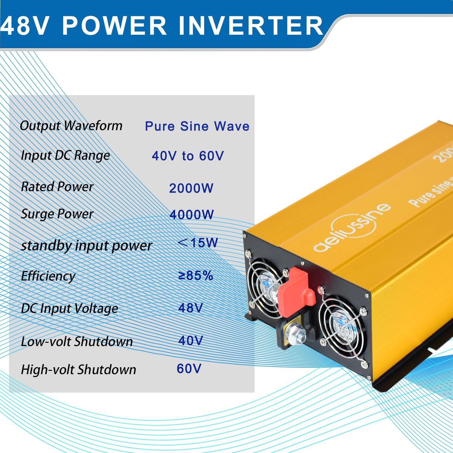 - 【pure sine wave inverter】Smooth and perfect sine waveform, just the same as home power/city power, Provide max 2000 watt continuous power and 4000 watt peak power at 60Hz frequency, power your 110v 120v ac appliance with a 48v power battery bank (battery voltage 40v to 60v is acceptable)