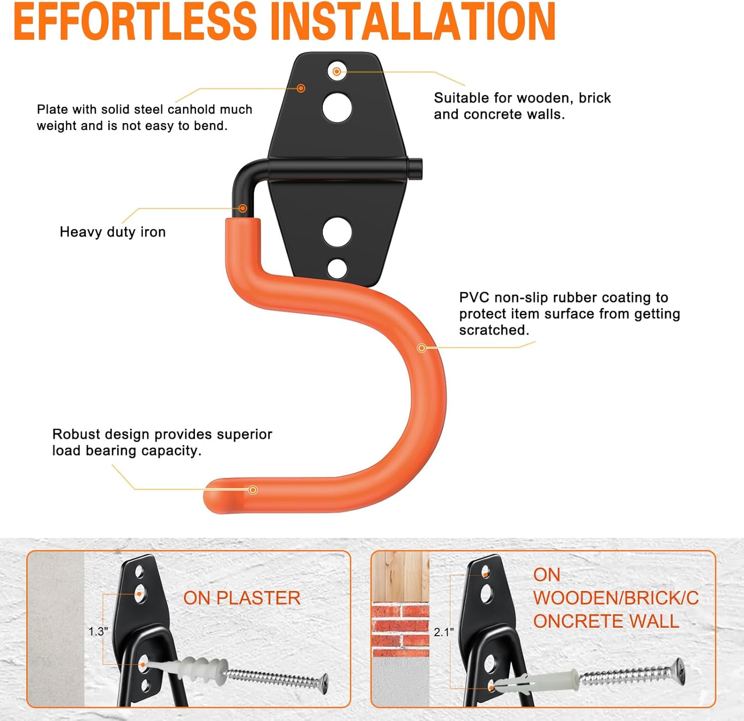 - 【Easy Installation】The garage hooks come with two types of screws, including 12 sets of screws and wall plugs, to accommodate different wall surfaces. Depending on your storage needs, you can install the garage wall hooks on brick/concrete/wood walls or drywall.