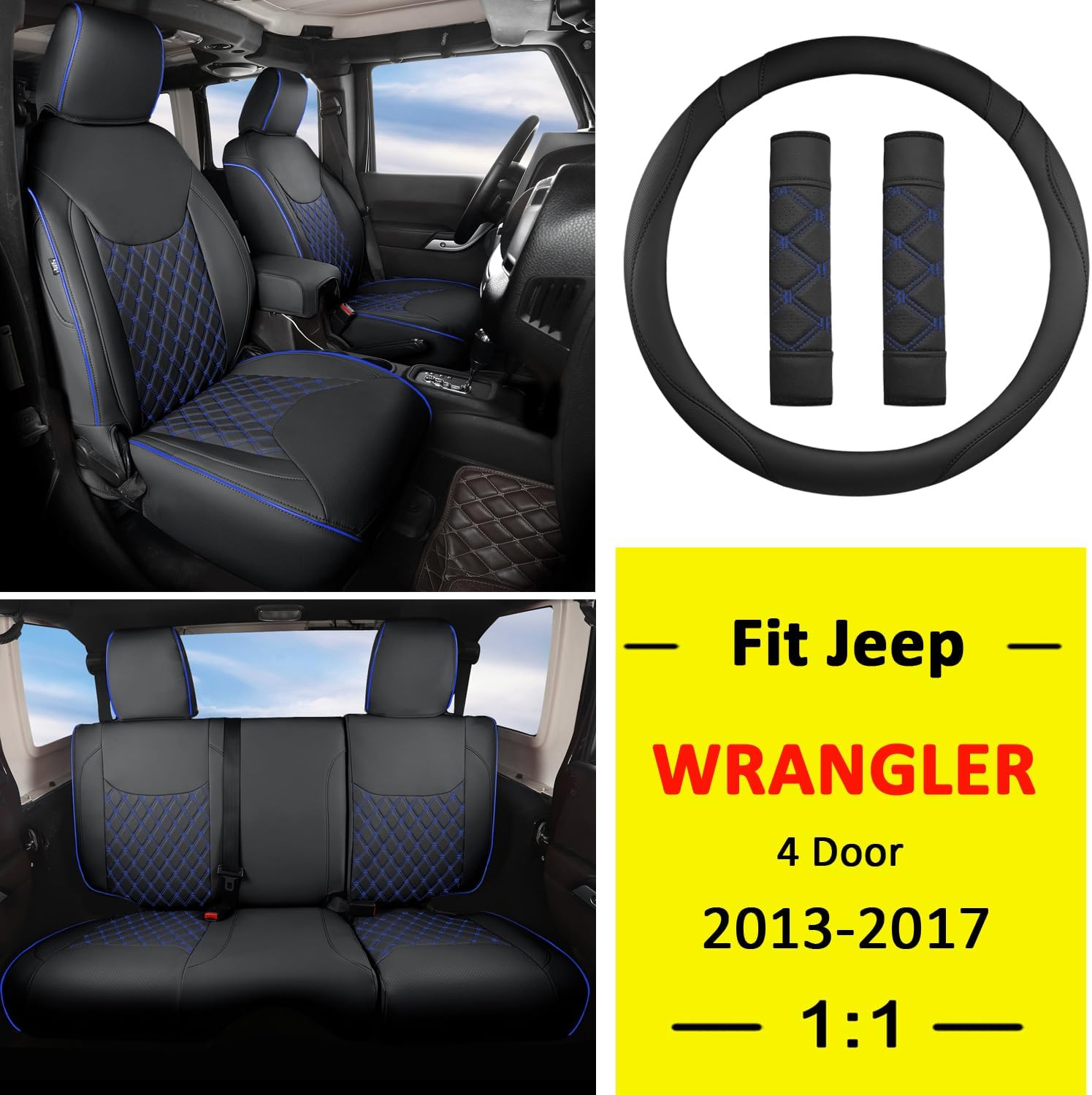 GIANT PANDA Customized Full Set Car Seat Covers for Jeep Wrangler 4 Door JK Sahara Sport Rubicon Unlimited Willys Wheeler Altitude 2013 2014 2015 2016 2017, Faux Leather - (Black+Blue)