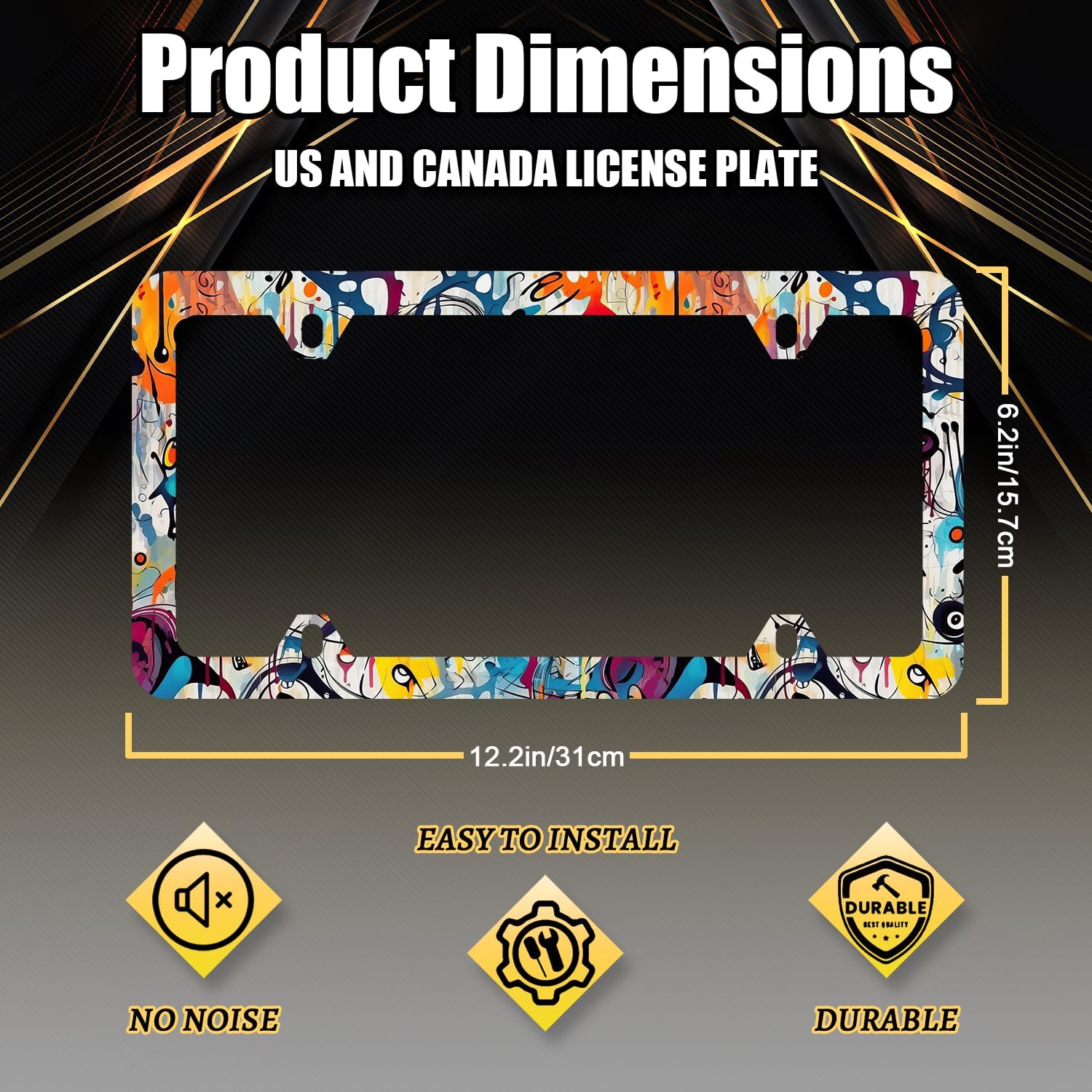 Abstract Graffiti Pattern License Plate Frame Colorful License Plate Stainless Steel Car Accessory Funny License Plate Auto Parts Decoration Men Women Size 12.2" x 6.2" with Screws