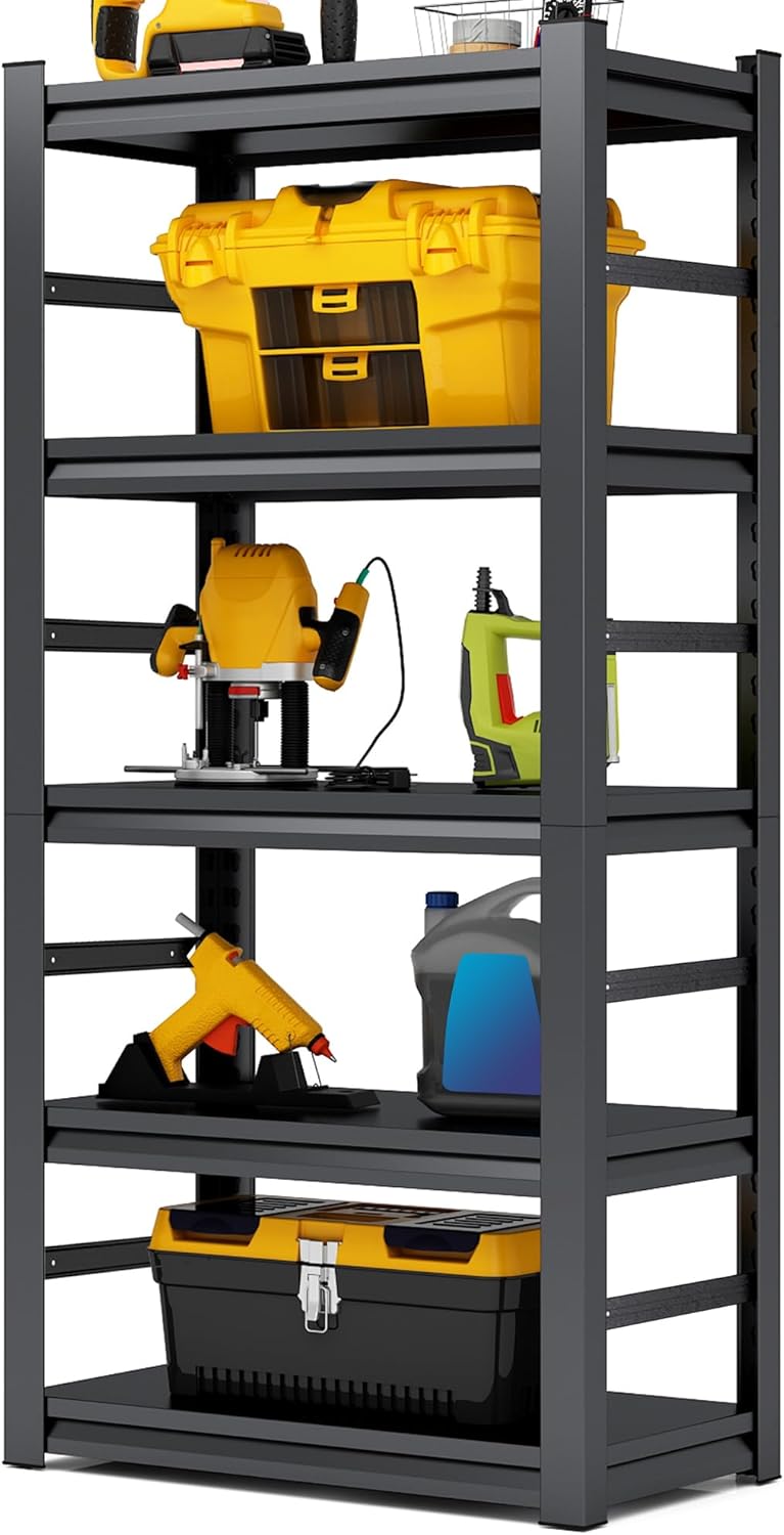 - 【Heavy Duty 5-Tier Storage Shelving Unit】: Our garage storage shelves are made of solid & quality metal, which is more sturdy and tough than normal storage shelves. Featured with powder-coated smooth metal frame, this 5-tier shelving unit is corrosion and rust-resistant, can be sturdy and stable enough for long time using to organize heavy-duty stuff.