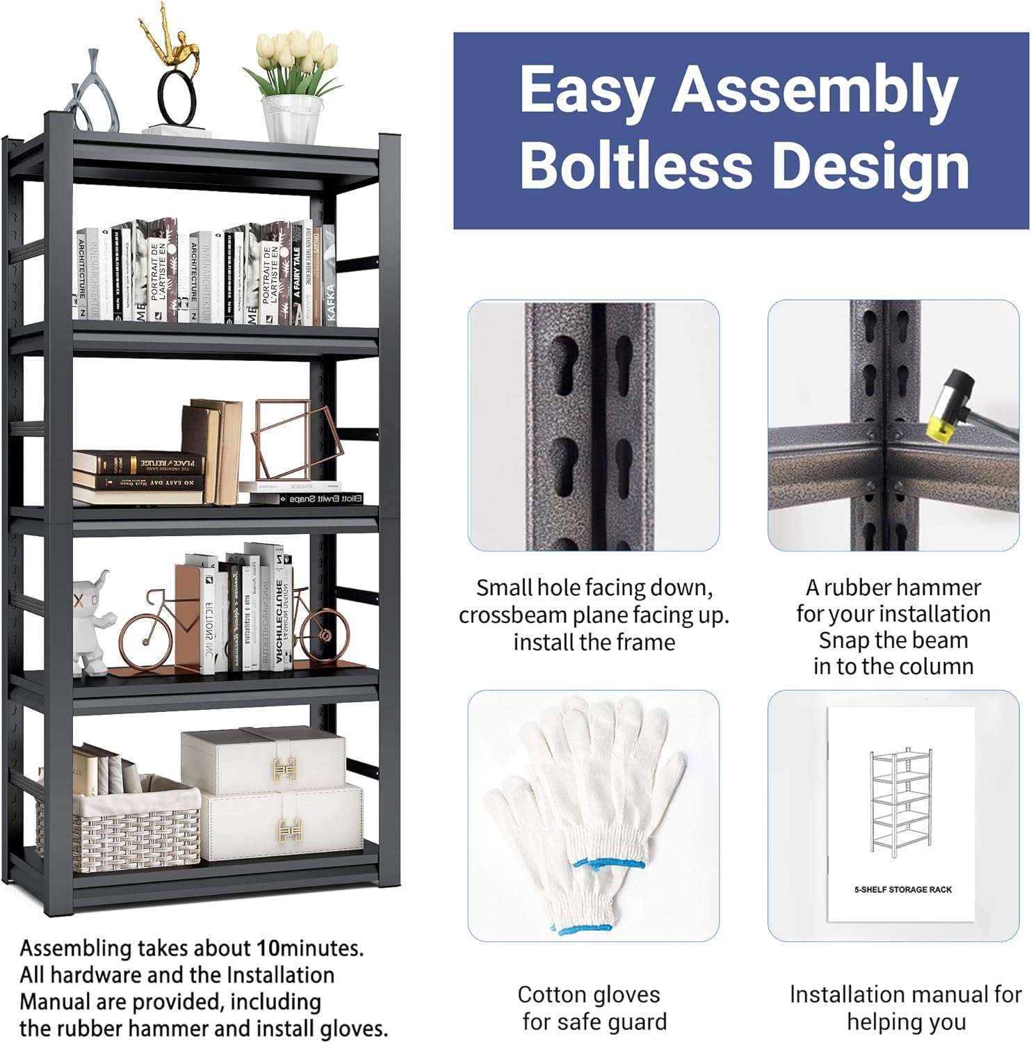 - 【Easy to Assemble】: There are no nuts or bolts required, so you can in stall this heavy duty garage storage shelf quickly, we offer a rubber mallet and a pair of gloves, please us the mallet to tighten the shelving rack. This garage shelving is also equipped with rubber footpads, which can protect the floor, add extra stability and avoid the shelving sliding accidentally.