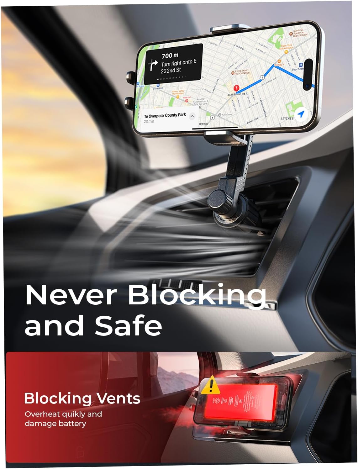LISEN Phone Mount for Car Vent [Never Blocking] Rotatable Car Phone Holder Air Vent Clip 2024 Hands Free Cell Phone Car Mount for iPhone 15 Pro Max Plus 14 13 12 Samsung Android, Silver