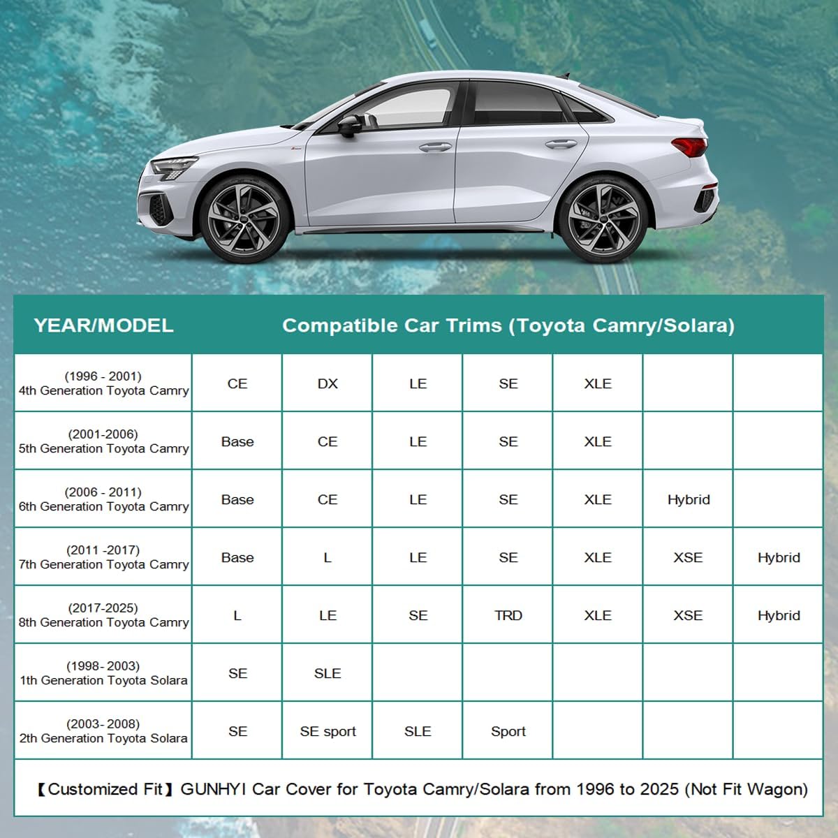 - ăCompatible withăThis Full Car Cover Custom fit for Toyota Camry/Solara from 1991 to 2025. Comes with a microfiber towel that you can use to clean your car, because if there is sand on the surface of the car before use, it may damage the paint.