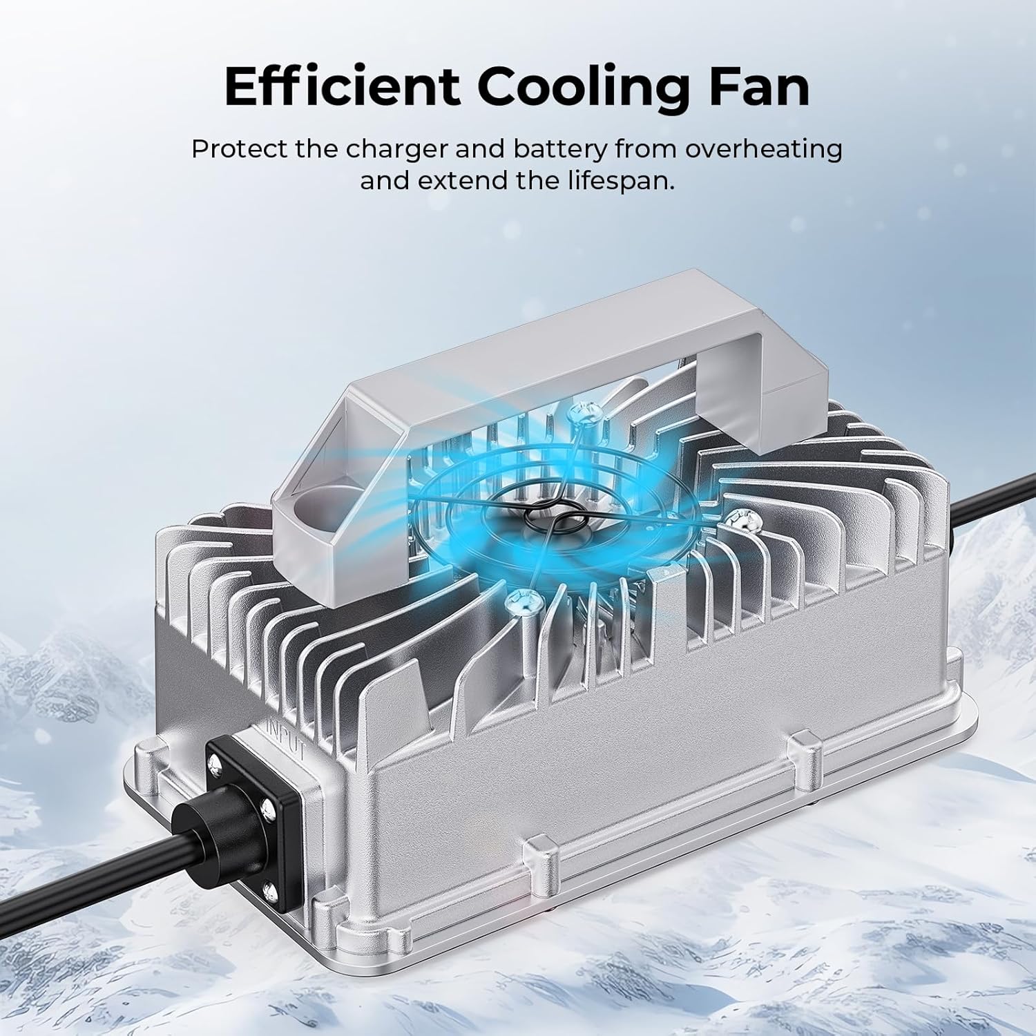 - 【Efficient Cooling Fan】: The lithium battery charger has a reasonable structure and good thermal design that make the battery charger small in size, Iight in weight and has good portability. In addition, there is a cooling fan on the outer surface of this 12V LifePO4 battery charger, its heat dissipation is very good, which can avoid overheating and ensure the lithium battery charger works silently and at low temperature.