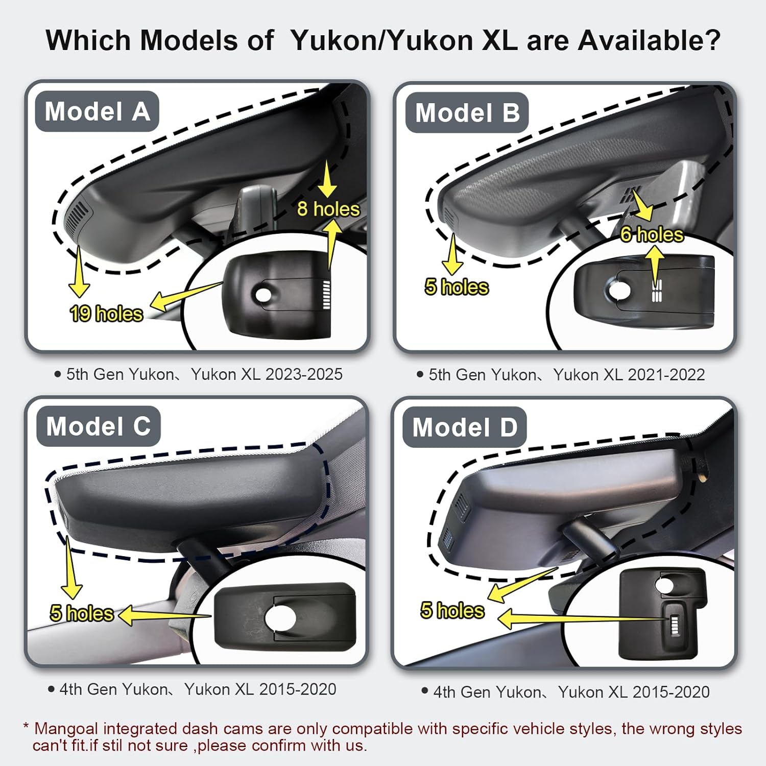 - ăCustom fit for GMC YukonăMangoal 4k dash cam can fit perfectly behind the rear view mirror like original. No messy wiring exposed, no complicated rewire at all. Perfectly intergrated with GMC Yukon, Yukon XL 2015 2016 2017 2018 2019 2020 (Model C), Such as SLE SLT Denali.