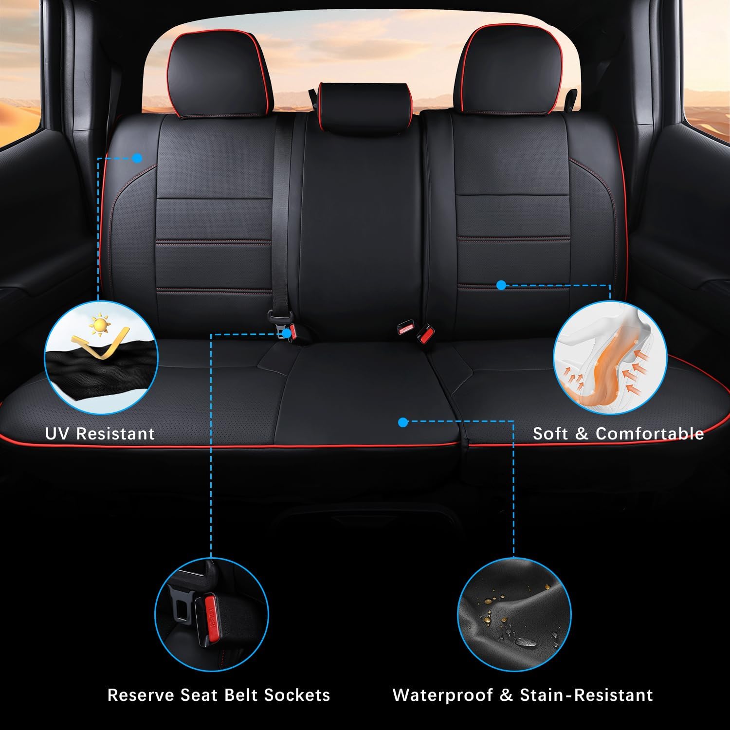 Car Seat Covers Full Set for Toyota Tacoma Double & Crew Cab 2023 2022 2021 2020 2019 2018 2017 2016 Tacoma Interior Accessories Premium Faux Leather Breathable Waterproof (Black+Red Line)