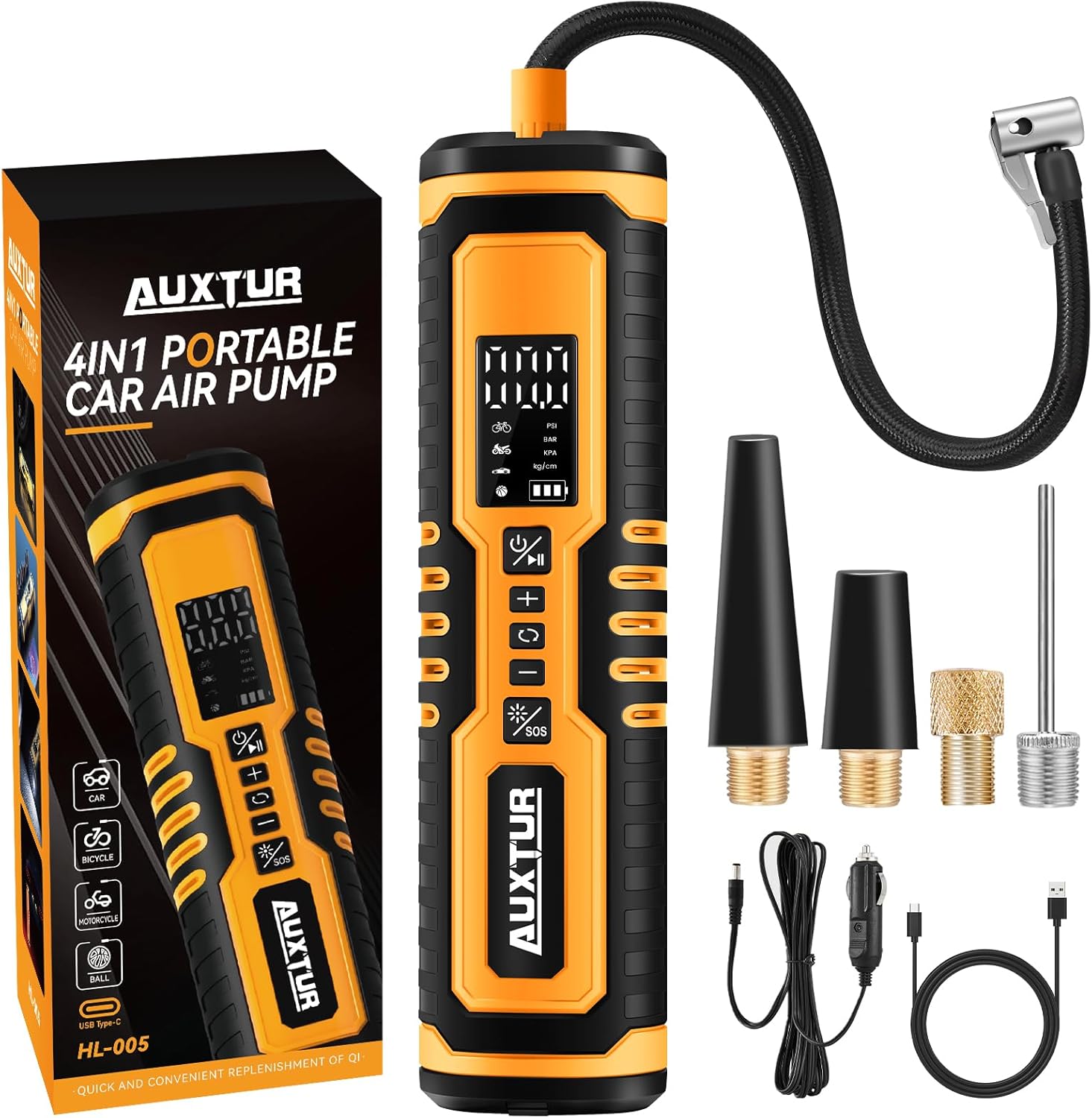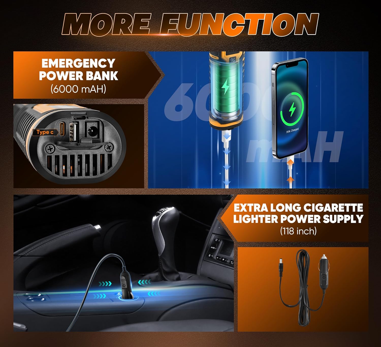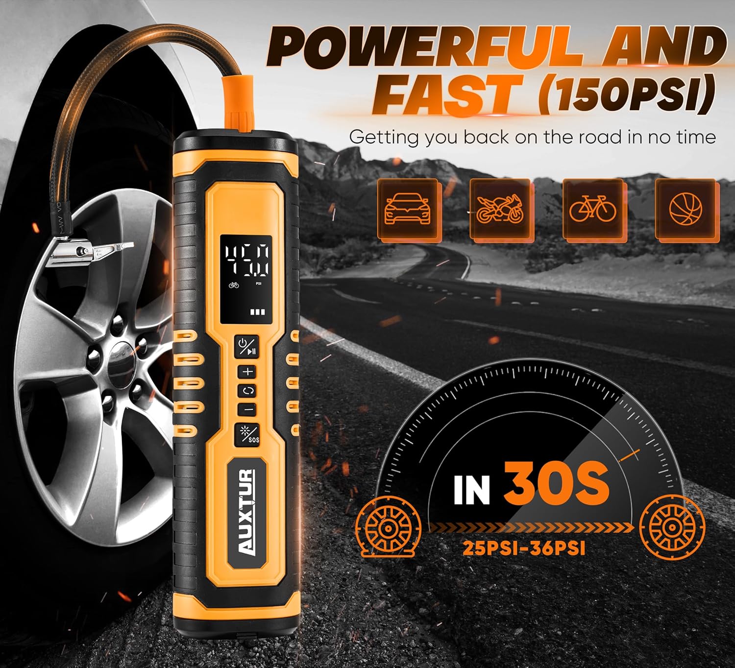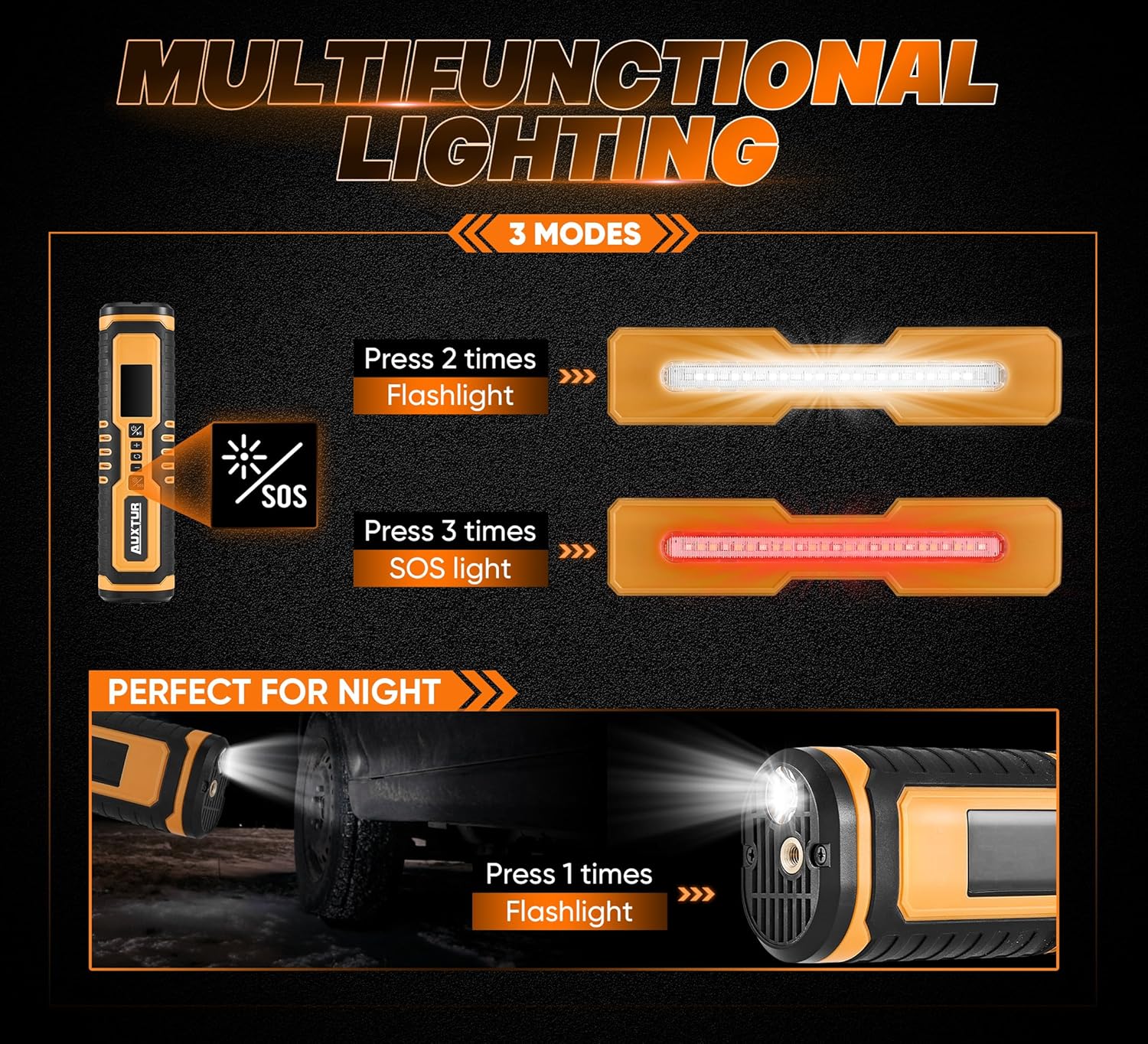- Versatile: Whether you need to inflate car tires, motorcycle tires, or even balls and inflatables, this multi-purpose pump has got you covered. It is compatible with various vehicles and items, making it a convenient choice for all your inflation needs.This air compressor goes beyond just inflating tires. It also functions as a power bank, SOS emergency light, and jump starter, making it an essential tool for any roadside emergency.
