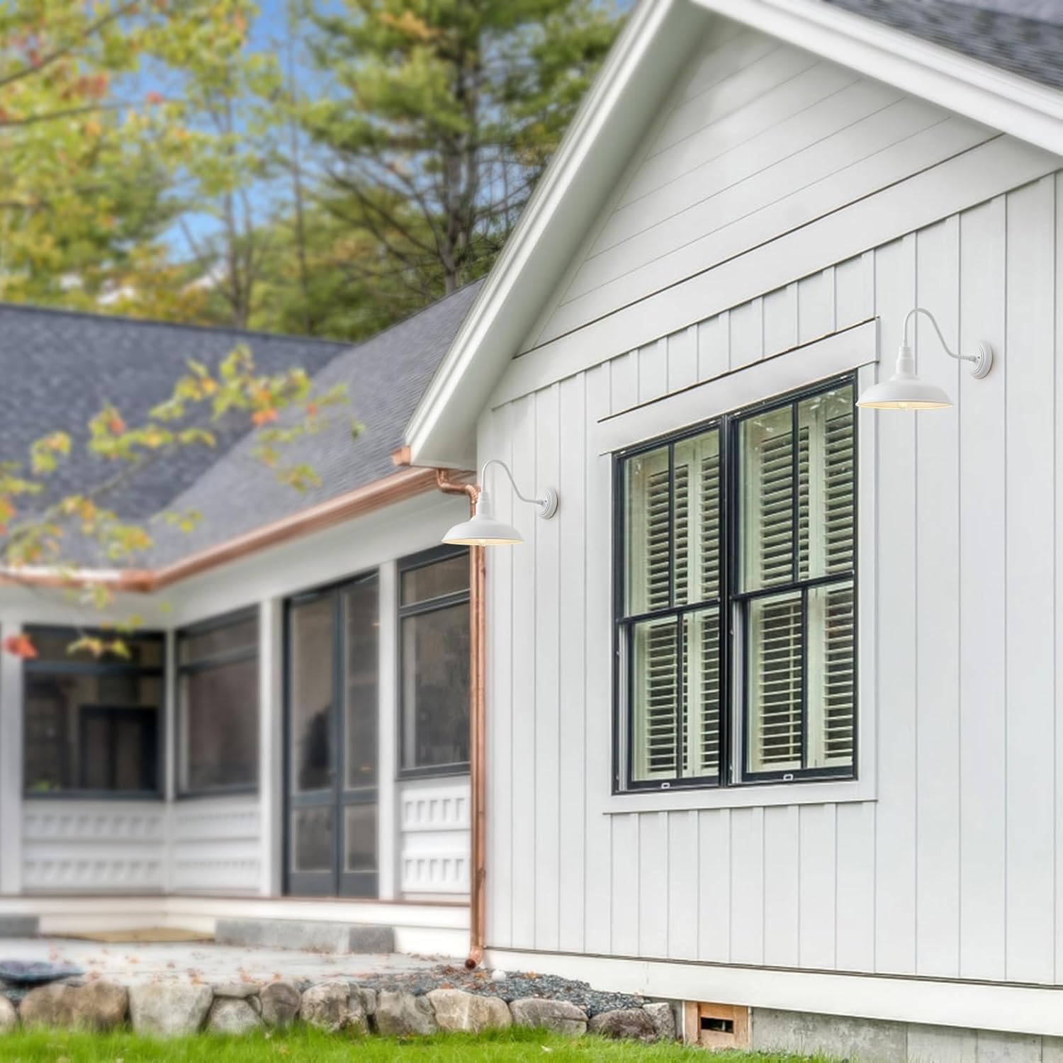 - Outdoor Light Fixture Makes Your House Look Unique Stylish: Featured with its retro goose neck arm and simple 14 inch dome design, finished by a high-tech white powder coating process, this barn farmhouse light brings a pleasing and simplistic elements to both exterior and interior place. The open bulb area of this sconce also spreads the light farther, meeting the illumination needs for your farmhouse, cabin, garage, doorway, garden, yard, front and back porch