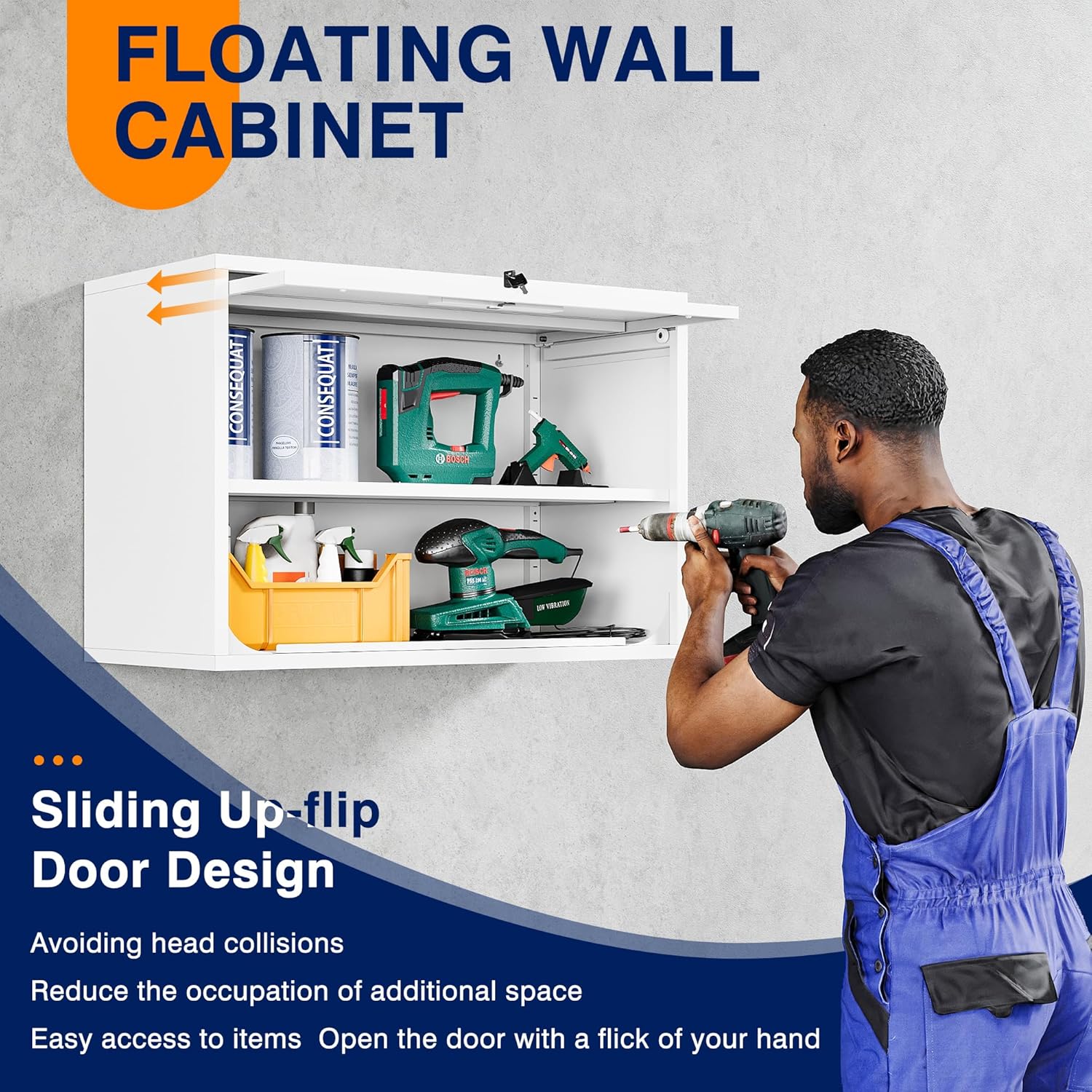 Yizosh Metal Wall Cabinet with Doors and Shelves, Floating Storage Unit for Garage or Basement (White, 21.6" H)