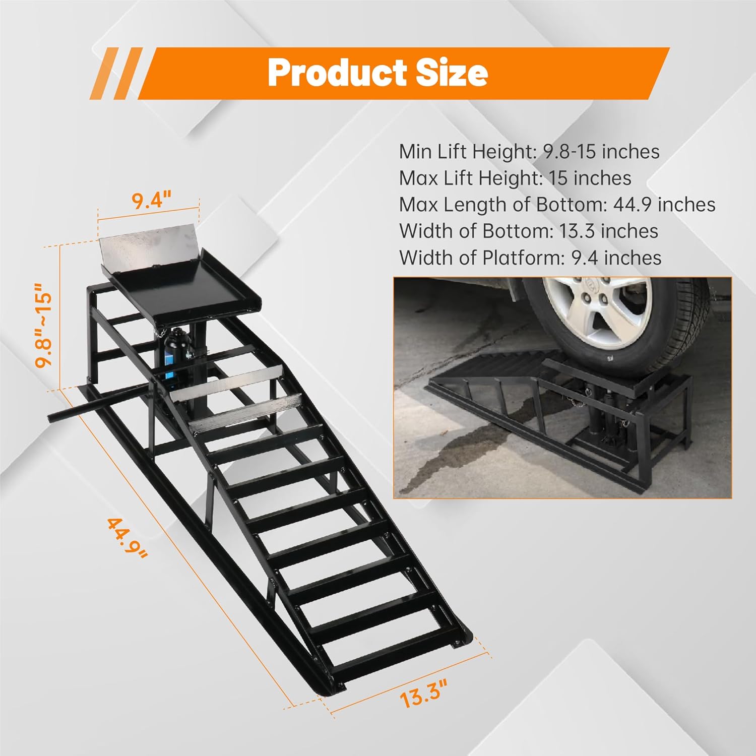 - Vehicle Ramp Lift Size: Min lift height:9.8 inches,max lift height:15 inches,max length of bottom: 44.9 inches;width of bottom:13.3 inches;width of top:11.4 inches; width of platform:9.4 inches