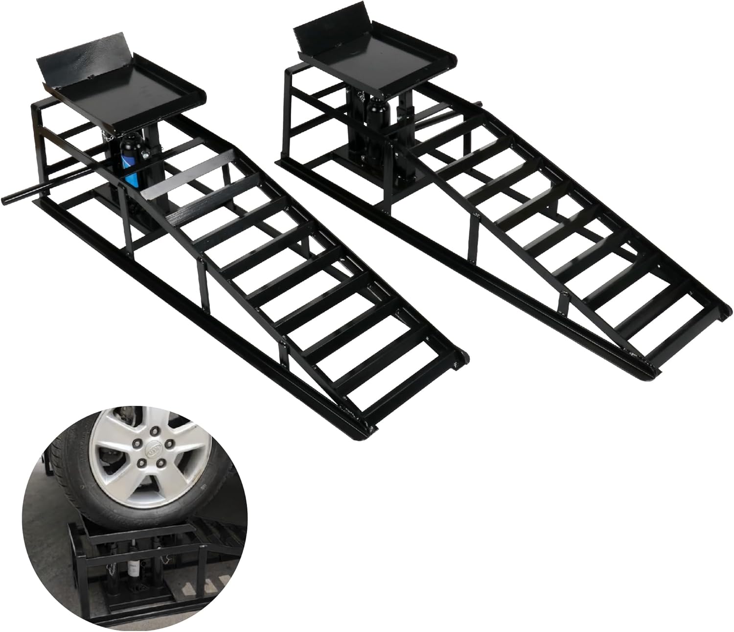 - Easy Operation: 5 ton hydraulic jack built into each ramp provides greater flexibility.No more trying to struggle getting a hydraulic jack under a lowered vehicle for service or scraping the front clip of a lowered car with standard car ramps
