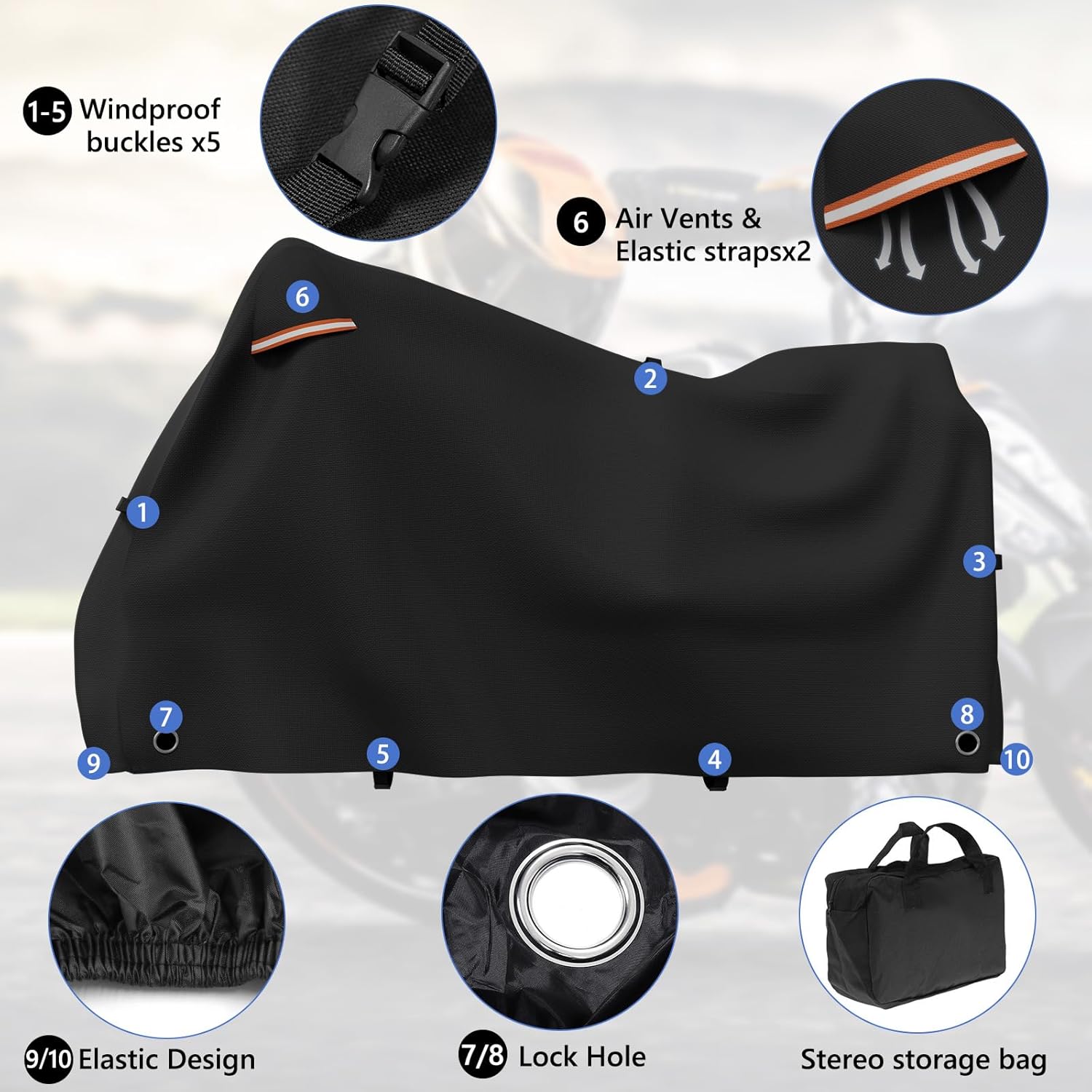 - ăUnique Designsă(1) Two air vents prevent moisture under the cover. (2) Waterproof Black PU Coating: UV protection and heat-proof,prevent cracking and aging of inner decoration leather and plastic. (3) Two full Orange Reflective Strips to prevent collisions during the night and depict the body of your motorcycle with a chic look. (4) Antenna openings with Velcro, 2 Anti-theft lock holes(No locks) and a stereo storage bag.