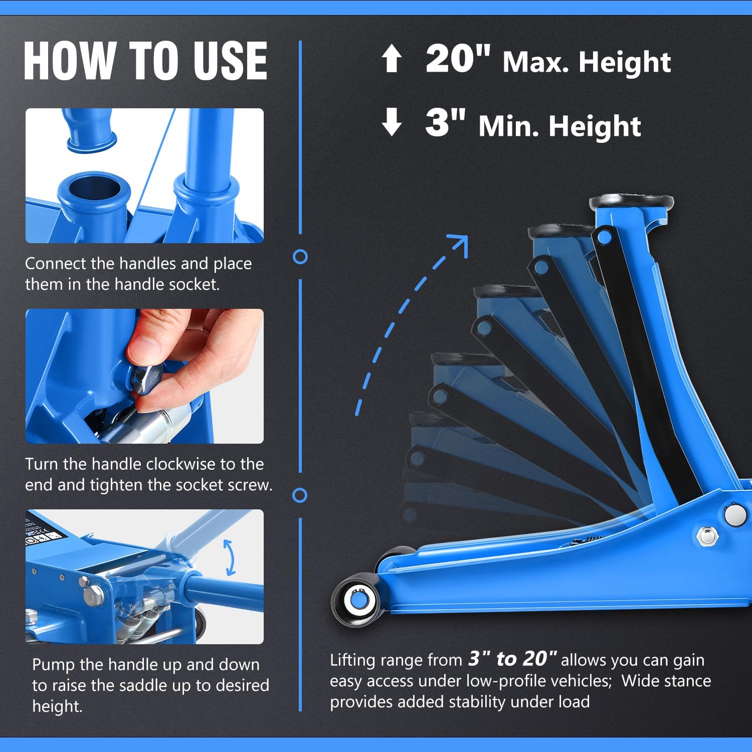 - OVERLOAD PROTECTION & EASY JACK POSITIONING - Built-in dependable safety release valve triggers in the event of an overload to prevent damage or injury. The large saddle equipped with rubber pad provides extra stability and helps protect your vehicle.