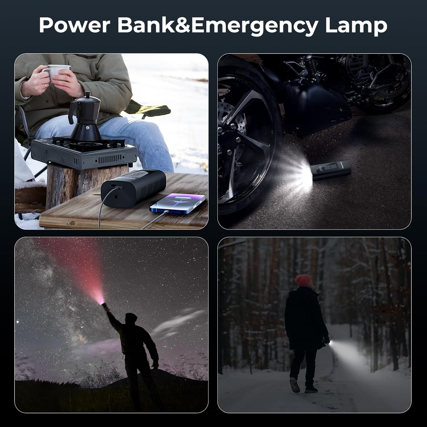 - 🚚【3 in 1 Device 】 Inflator, Power Bank and Flashlight. - In addition to serving as an portable air compressor, you can use it to charge your mobile phone, bicycle light, switching mechanism battery, etc. The top LED light (3 light modes) of this air pump which can be provided convenience for you to inflate and change tires in the dark, or warn other vehicles at night.