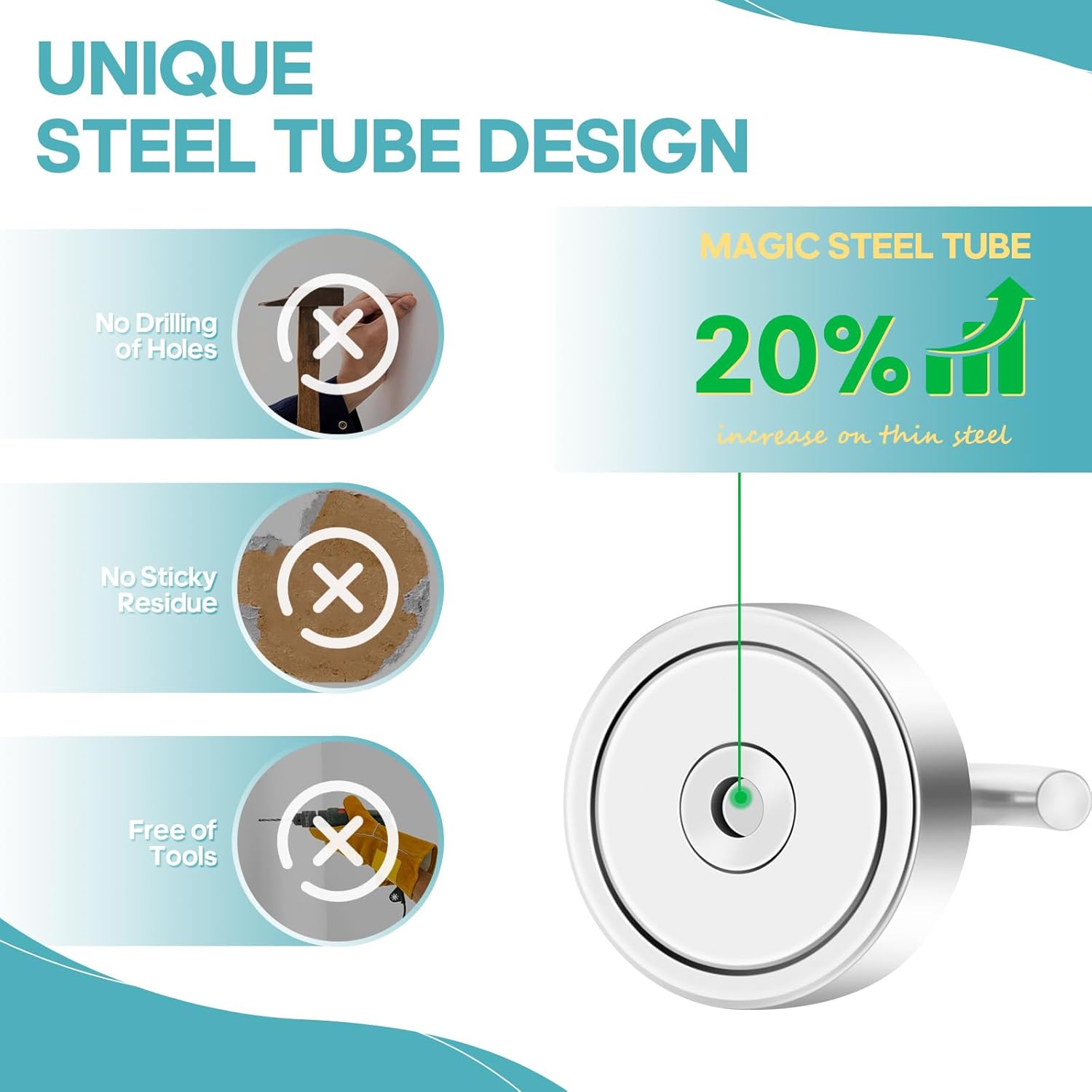- ✔MAGIC STEEL TUBE DESIGN - Unique design of steel tube inside the base of magnetic hooks greatly increases the attractive force , especially on thin steel! It increase approximately 20% force comparing those none-tube magnets. it solves the problem of weak force on thin steel. Permanent magnetic hook with magic steel tube, strong magnetism lasts forever!