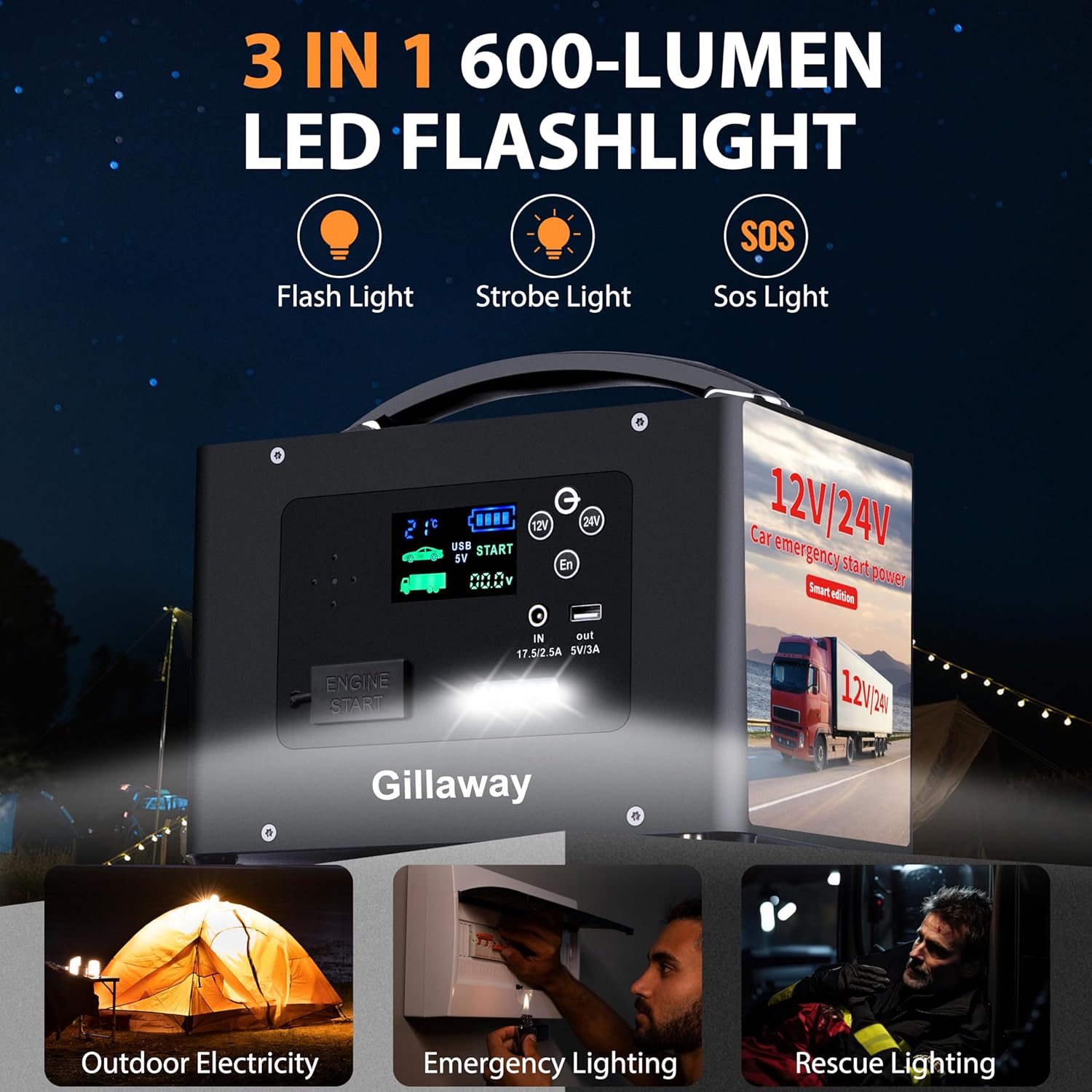 - 【PORTABLE POWER STATION AND LIGHTING FUNCTION】:This car jump starter can also be used as a 155 watt-hour mobile power source. It comes with a 5V/3A output USB port for quick charging of headphones, mobile phones, tablets or other electronic devices. The built-in 600 lumen LED light provides 48 hours of continuous illumination and offers three modes: light, flash and distress.