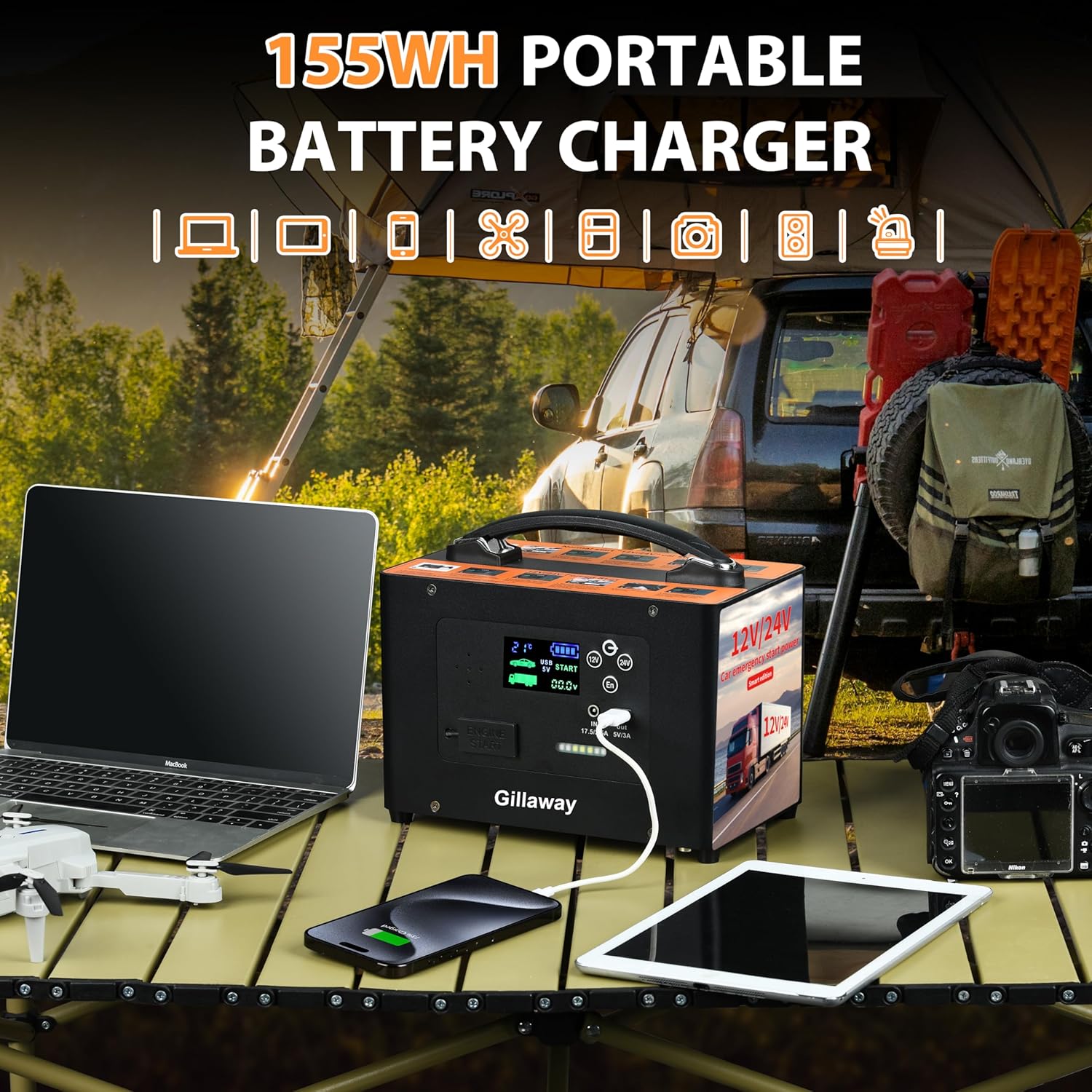 - 【42000mAh Portable Power Station】 V10-1 is not only a car battery jump starter, but also a portable power station for camping essentials with 155Wh, 42000mAh capacity and fast charging USB port (5V 3A) to charge mobile phones, tablets and other mobile devices. Takes only 3.5 hours to fully charge. Equipped with 600 lumens LED light with three modes: Illumination, Strobe, SOS Three modes for your choice.