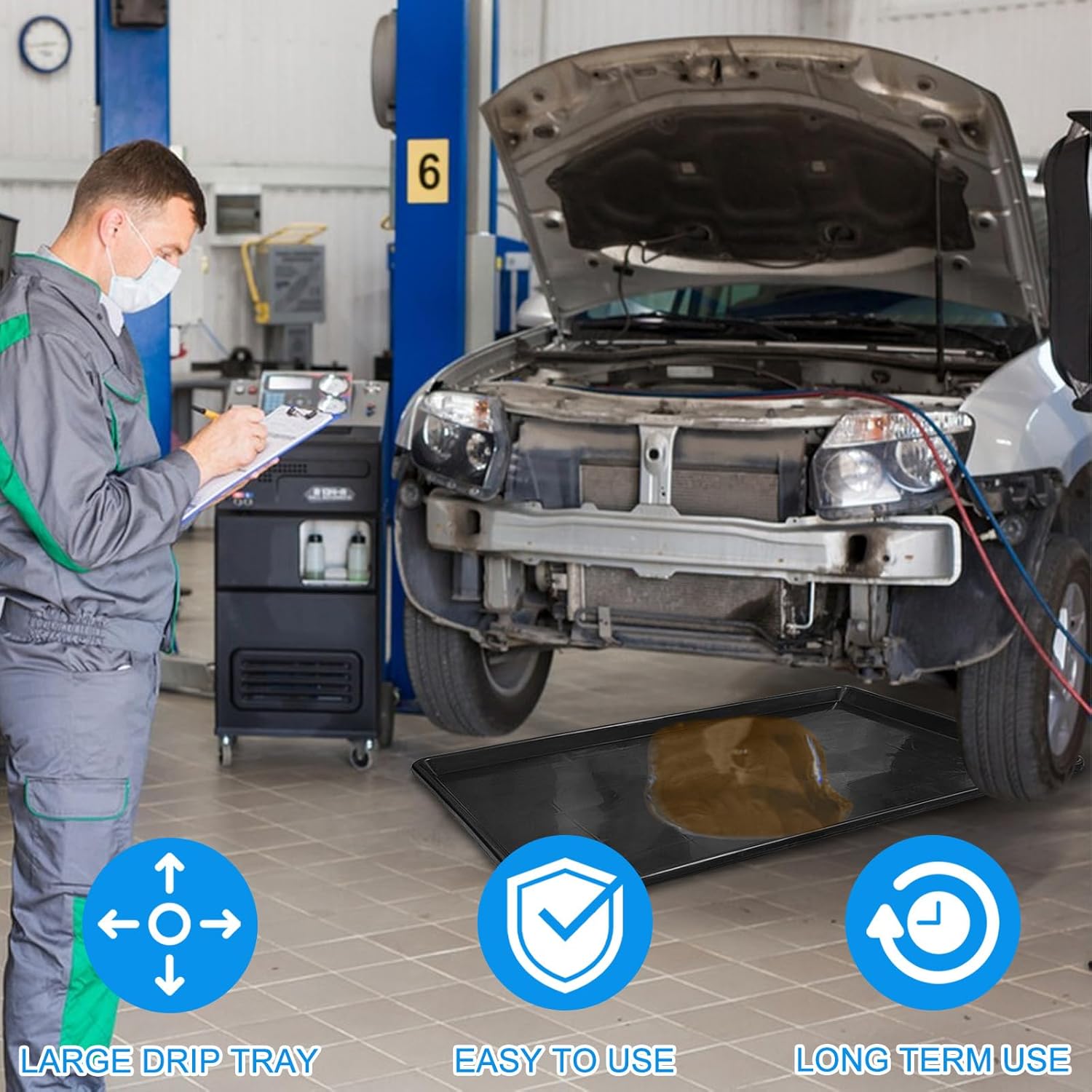 - Extra Large Automotive Drip Tray : Our car oil drip tray size is about 35.4 x 24 / 90 x 60cm, height is about 1.6 inches / 4 cm, the extra large size and edge height can minimize the occurrence of oil leakage, and square oil drip mat for under car can effectively collect the oil without staining the floor.