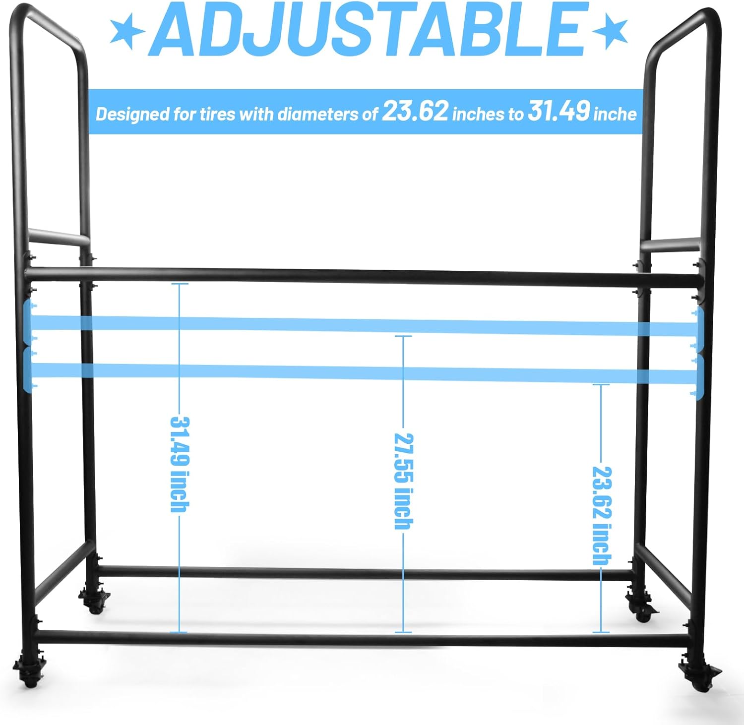 - Adjustable: The tire rack features 3 adjustable height levels, with a universal design suitable for any size vehicle tires such as winter tires,snow tires,track wheels,RV tires,ATV tires,Truck tire,Car tire,suv tire and more