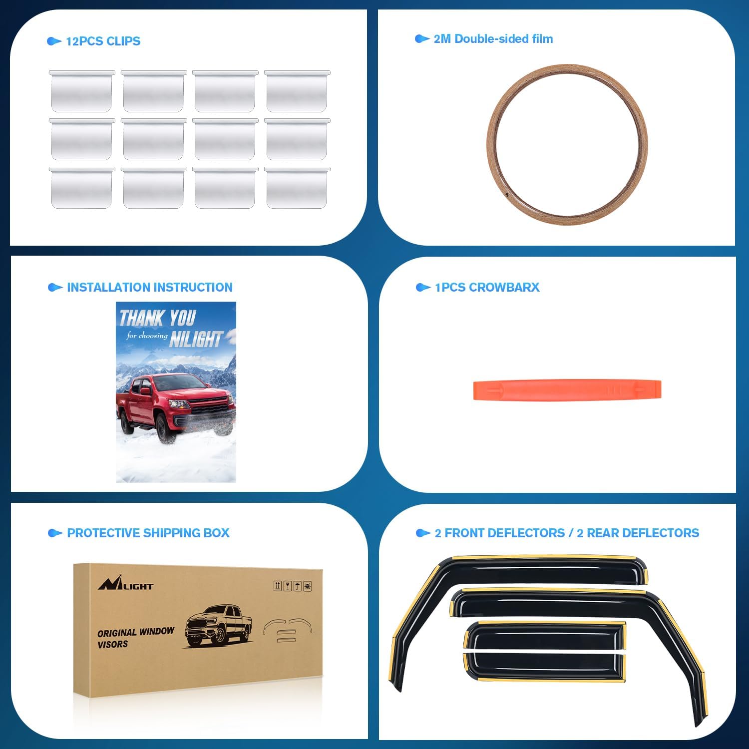 - PACKAGE INCLUDED:4 PCS Rain Guards,12pcs clips,Crowbar 1pcs,78inch double-sided tape and installation instruction