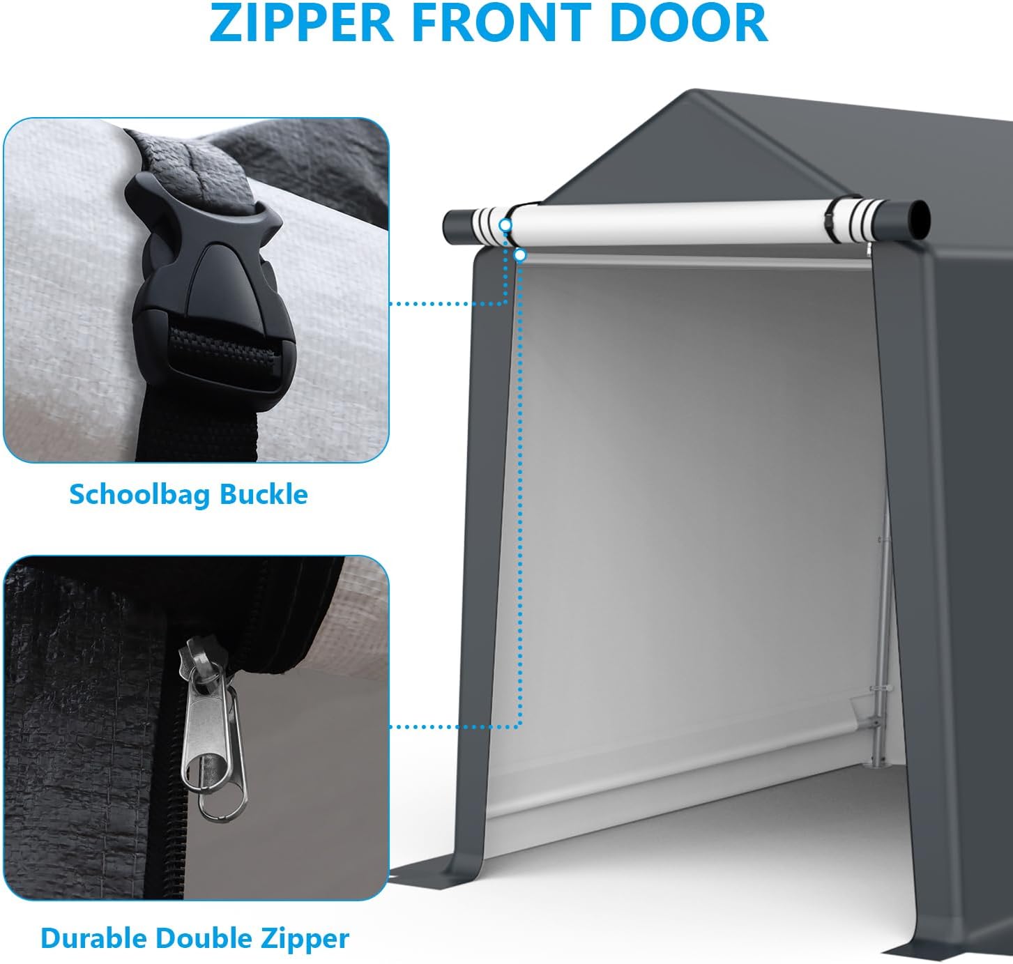 6x8FT Outdoor Storage Shelter Carport, Portable Shelter Heavy Duty Storage Shed Carport with Roll-up Zipper Door for Bike, Motorcycle, Garden Storage, Waterproof and UV Resistant, Gray