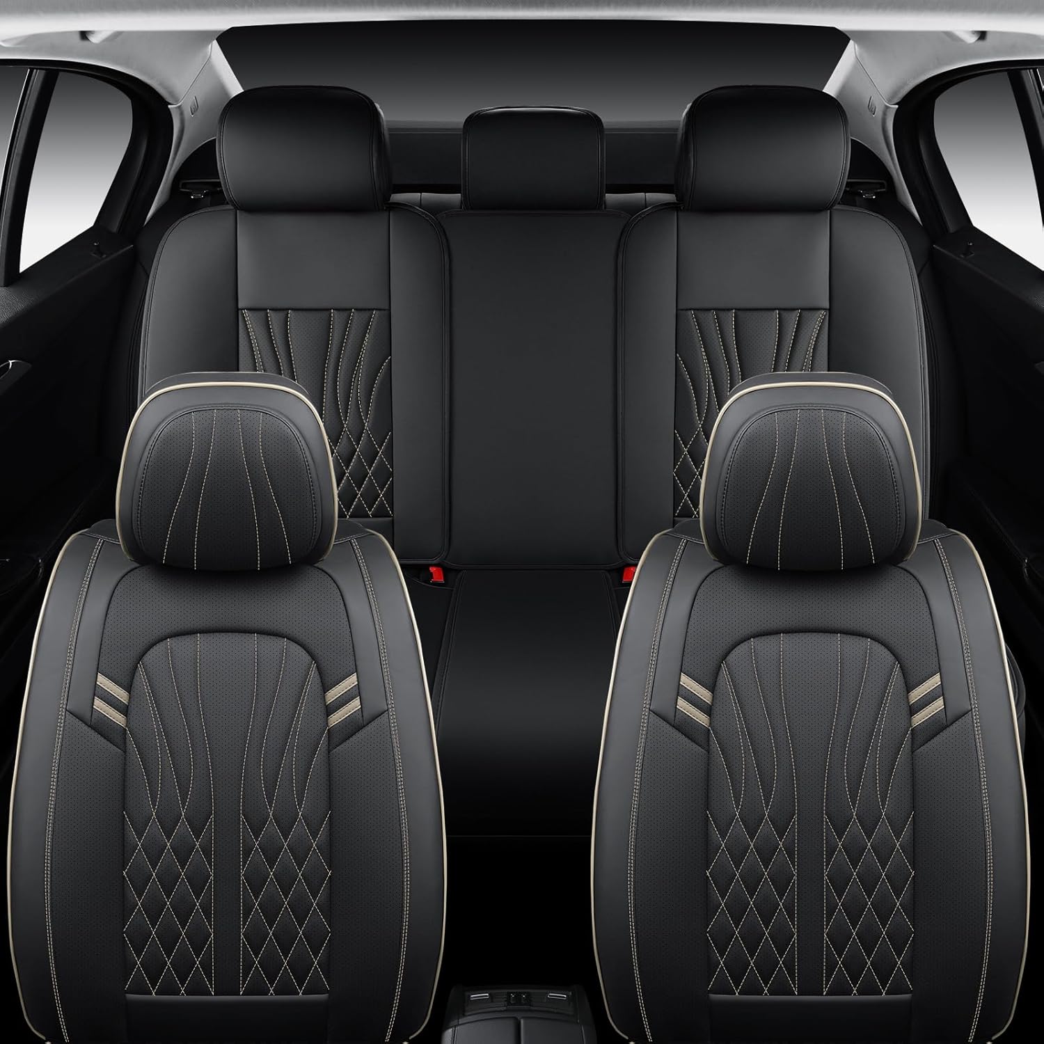 Leather Car Seat Covers 5 Pieces, Full Set Universal Seat Covers for Cars, Waterproof Nappa Leather Auto Seat Protectors, Black Car Seat Cover Most Sedans SUV Pick-up Truck Black&BeigeLine