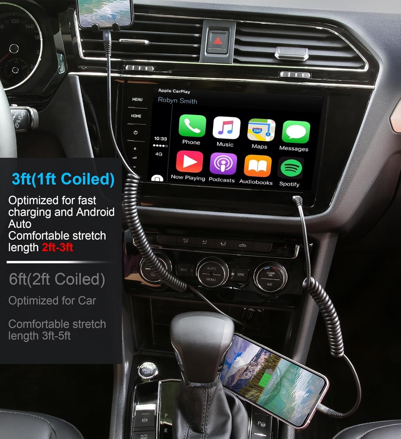 - Elastic Coiled Lightning Cable : Coiled lightning cable 3FT (stretchable to 4.8FT, comfortable stetch length 2ft-3ft) and bounce back to normal length. You can use it in the front seat of your car and store your iPhone device in a compartment or on the phone holder of the car.