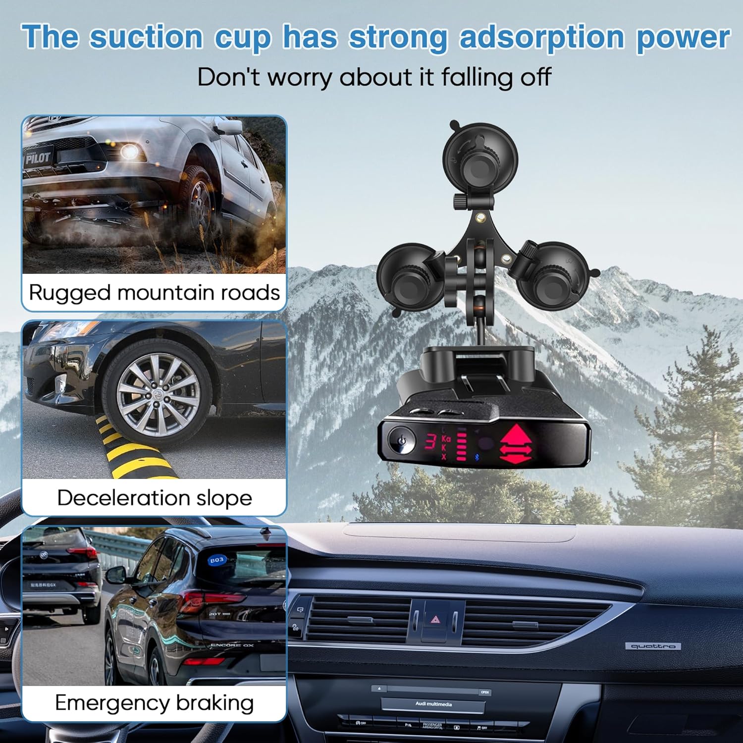 - HIGH QUALITY BRACKET Say goodbye to plastic brackets that are prone to falling off when exposed to high temperatures. Our triangular suction cup car mounted radar bracket is made of all aluminum alloy and has undergone anodizing treatment to improve corrosion resistance and wear resistance. No matter on rugged mountain roads, deceleration slopes, or sudden braking, there will be no shaking during driving, ensuring safety and stability without worrying about falling off