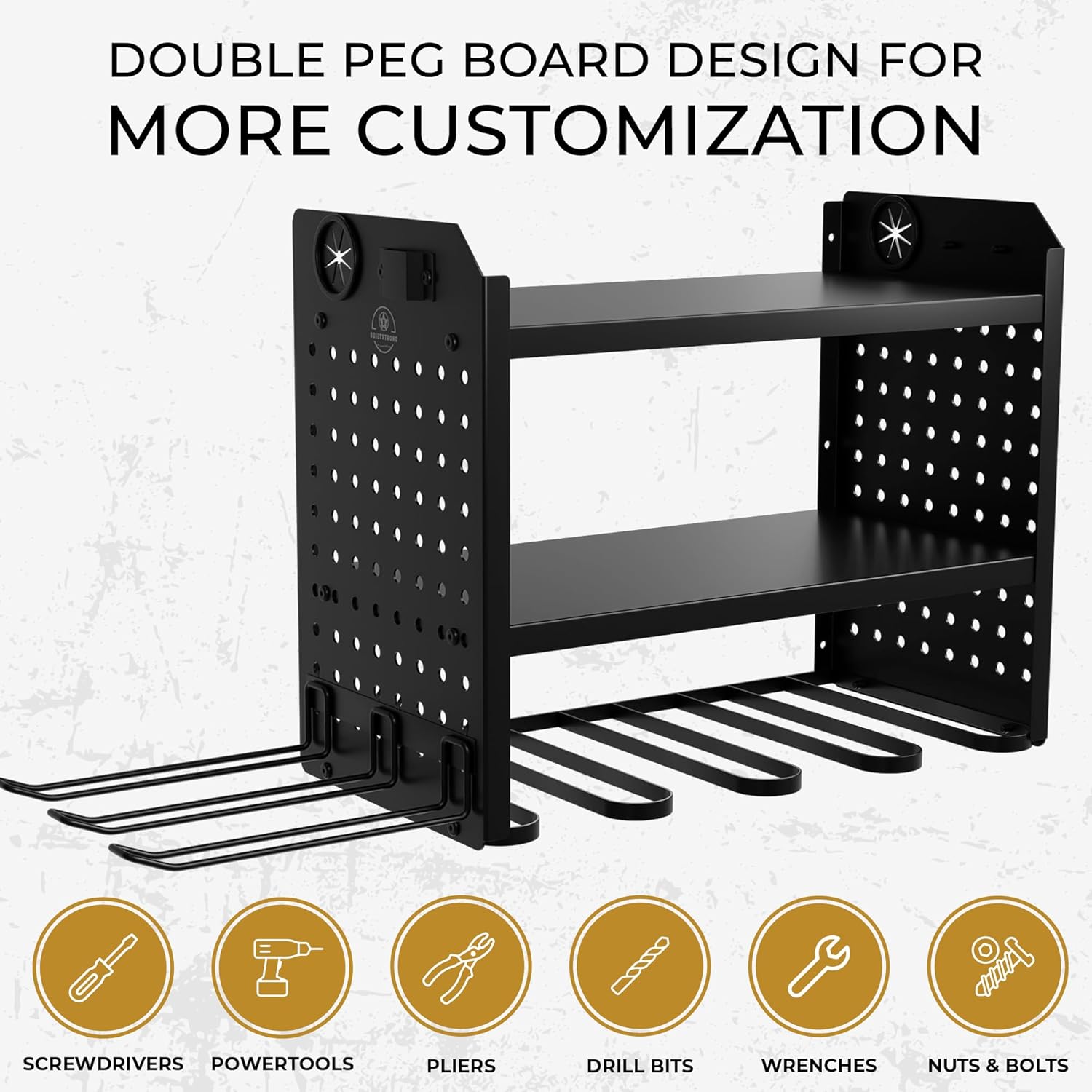 - THERE’S A SPOT FOR EVERY TOOL on our garage organizer with the dual customizable peg board panels, tape measure holder, power cord holder, 6 drill slots, 2 utility racks. Holds up to 100 lb!