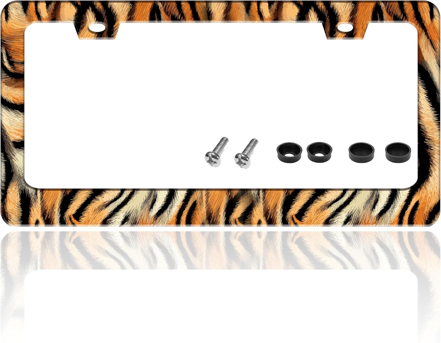 Tiger License Plate Frame Funny Tiger Skin Stripe License Plate Holder for Front or Rear Car Tags Reusable Durable Stainless Steel Car Decoration with Screws 6.3 X 12.2 Inch for Men Women