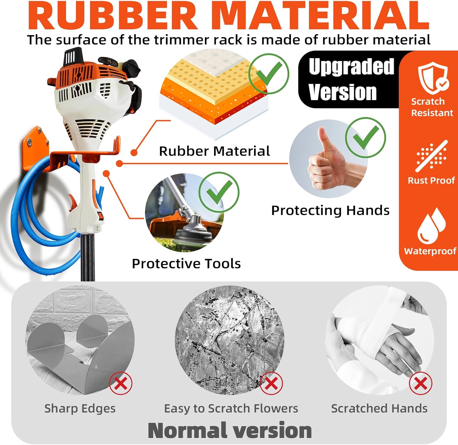 - Premium Materials: The trimmer rack is built from strong gauge steel, which is stronger and has high bearing capacity. The rack surface with orange ruber. Water-repellent and anti-rust, resistance to chipping and cracking.