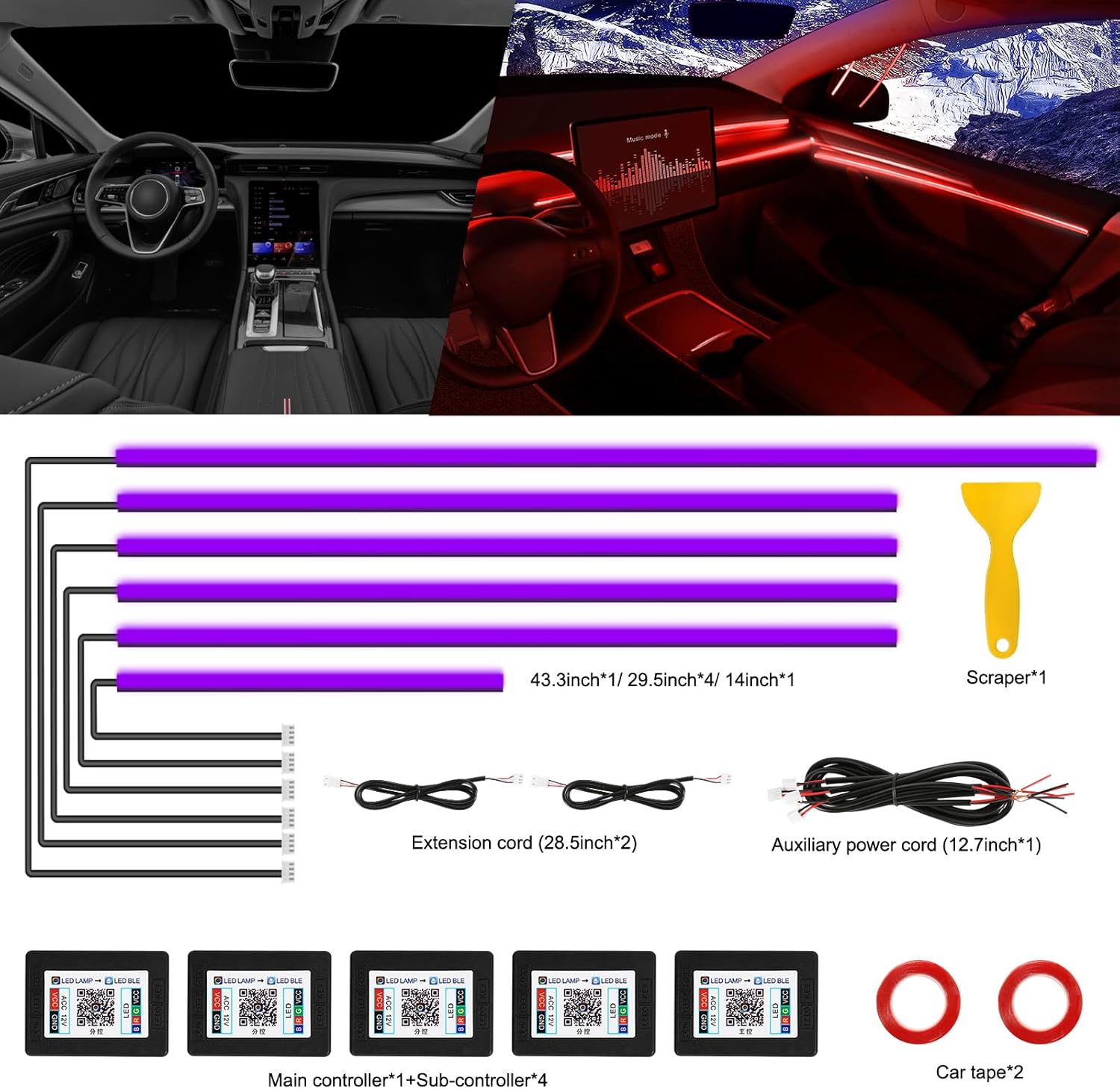 - ăHigh Bright & UniformăThe Acrylic Car Ambient Interior Lighting have super bright LED and acrylic lens and contains 6 LED strips (4*29.5inch+1*43.3inch+1*14inch), also comes with 1 main controller and 4 sub controllers,and can be flexibly installed on any car by DIY without disorganized, which is plug and play, and this acrylic light evenly spread over the lamp strip is brighter, more uniform and softer than other optical fiber lamps that rely on only one LED.