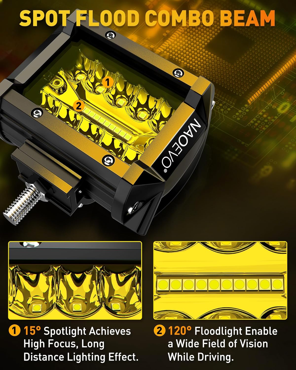 - [Spot Flood Combo LED Light Pods] - NAOEVO 4 inch led pods features 15° spotlight beam to provides high-focus, long-range visibility, while the 120° floodlight beam provides broader coverage. The powerful combo provides stronger lighting effect than other single-function led lights, catering to a range of lighting demands.