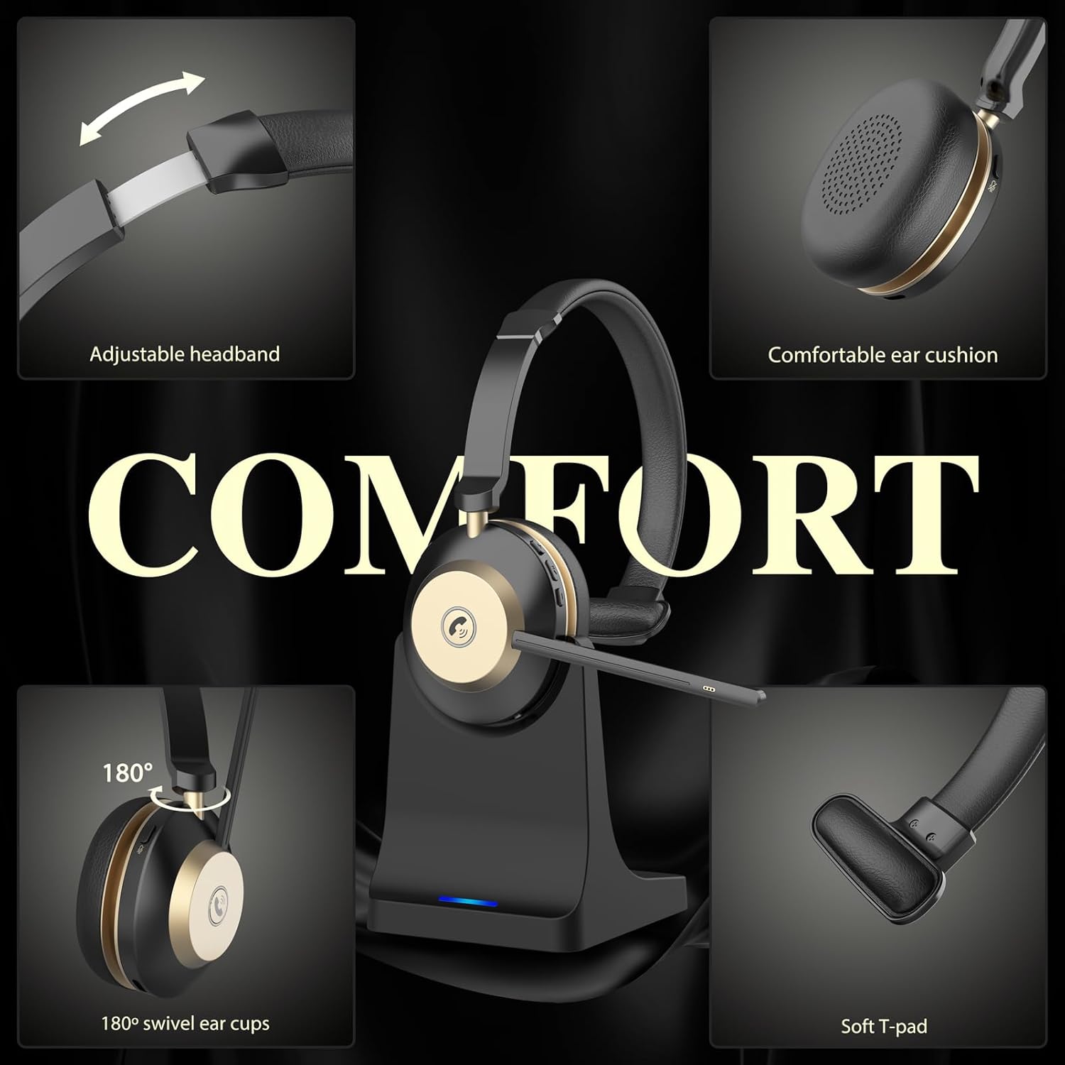 V5.3 Wireless Headset with Mic for Work, 45Hrs Computer Headset with Microphone, Bluetooth Headphones with Noise Cancelling Mic, Charging Base, USB Dongle & Mute Button for PC, Skype, Zoom