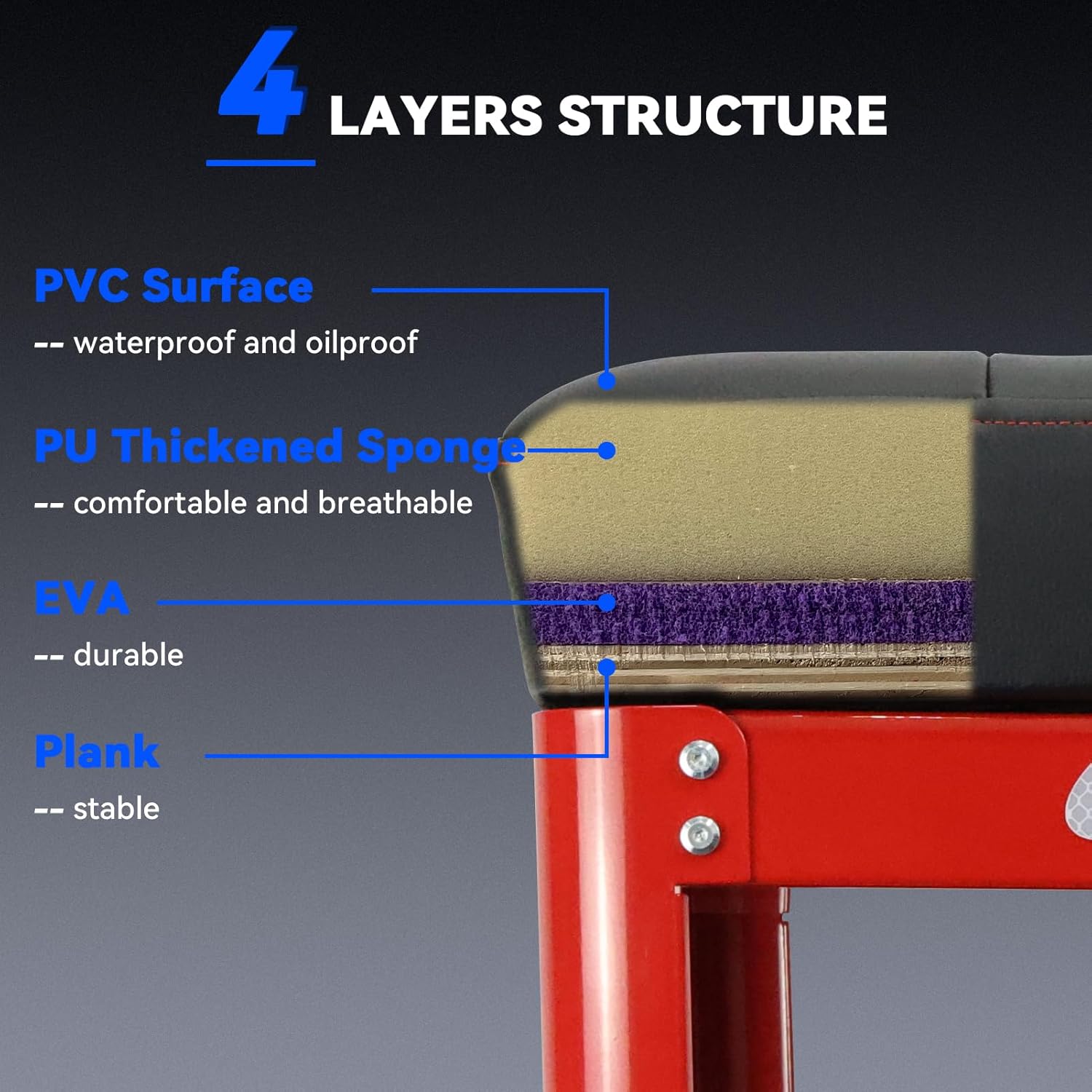 - 【4 layers Structure】The creeper seat cushion is 3.35 inches thick and consists of FOUR layers structure. The first layer is a solid wooden plank, the second layer is a durable EVA, the third layer is a comfortable and breathable PU thickened sponge, and the fourth layer is a waterproof and oilproof PVC surface. Soft, Firm, and Comfortable