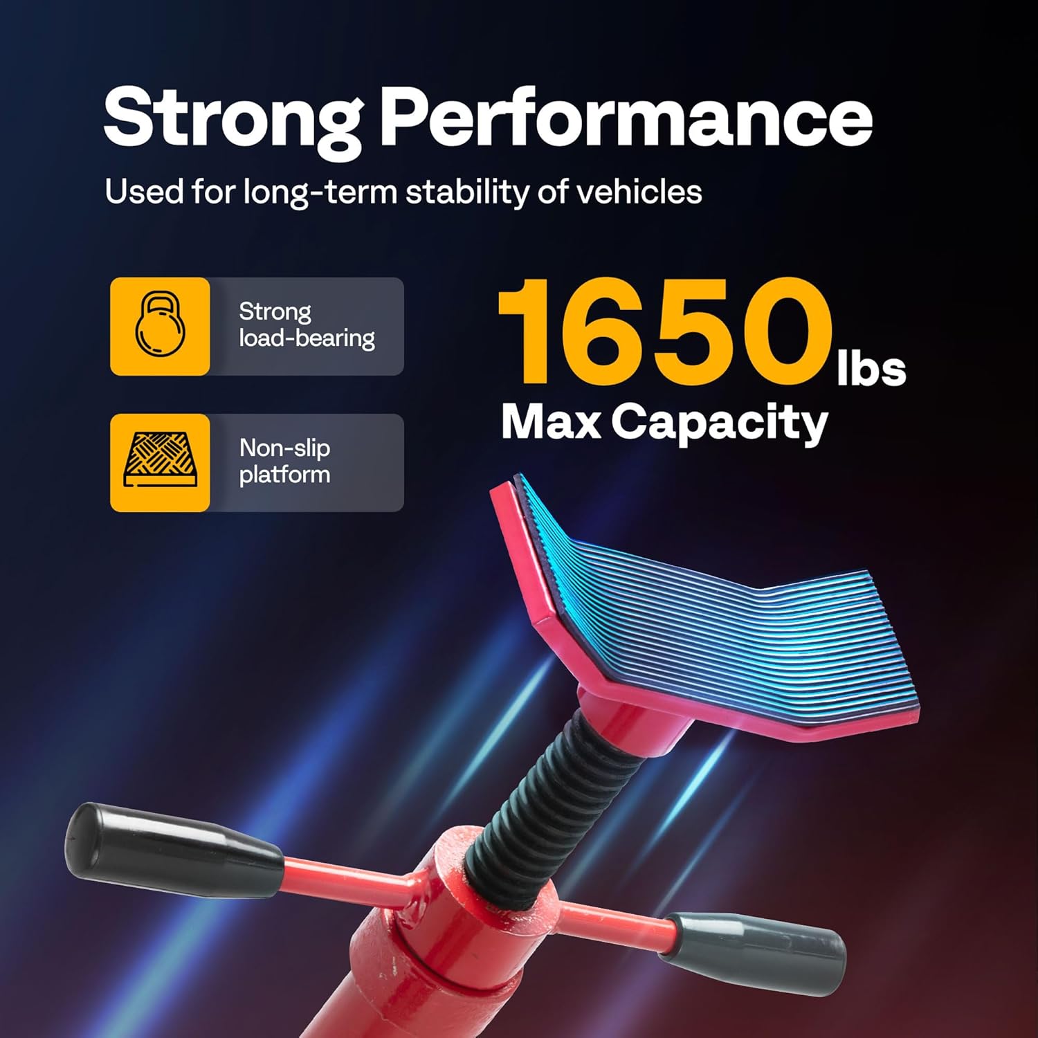 - IMPRESSIVE PERFORMANCE - This SPECSTAR underhoist support stand is capable of supporting up to 1650 lbs, making it an ideal tool for supporting or positioning vehicle components, exhaust system installations, and shock absorber replacement; Crafted from high-quality steel, this jack stand offers exceptional strength and durability, ensuring that it is built to last and resistant to deformation or twisting even under considerable pressure