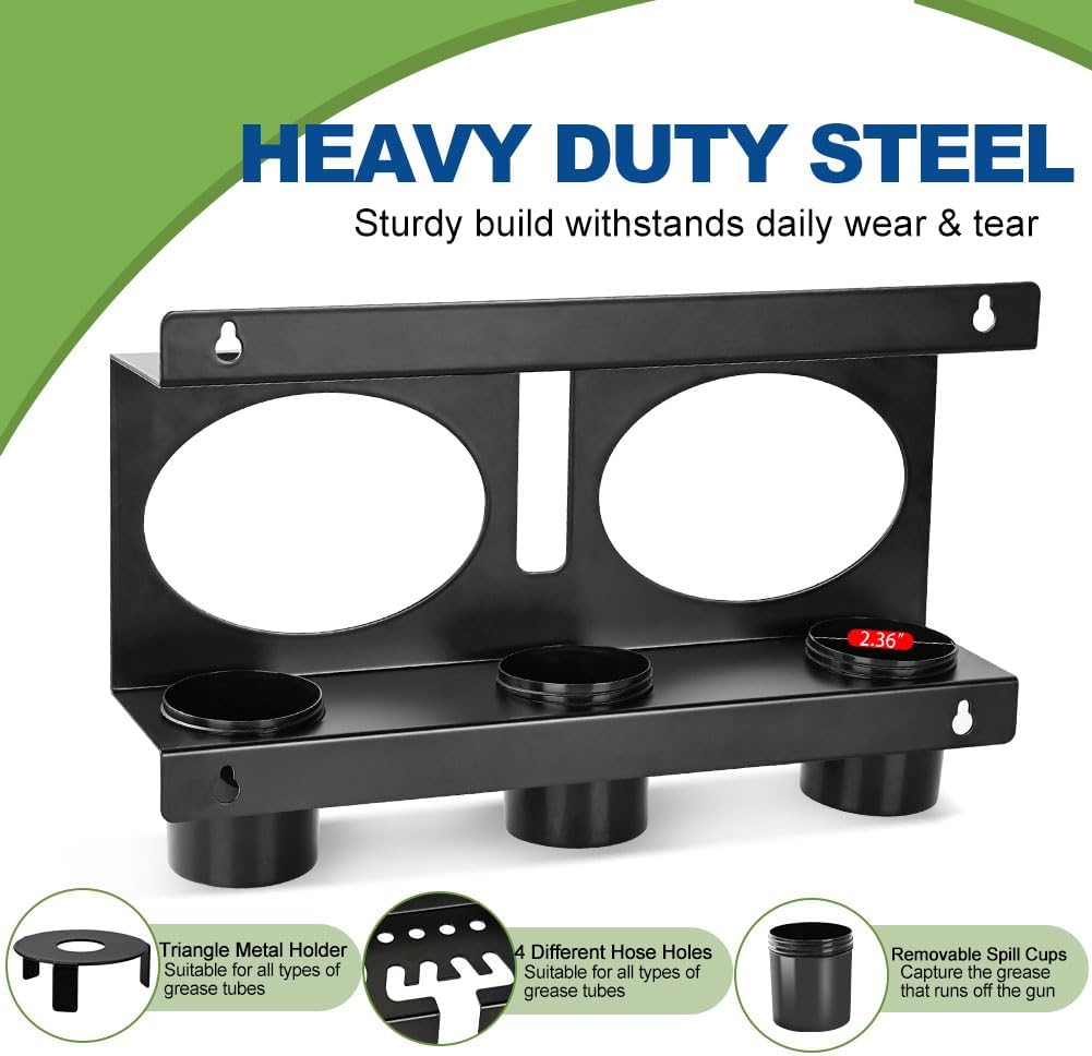 - HEAVY DUTY STEEL CONSTRUCTION: Made of heavy-duty steel that do not flex or bend, rust-proof, easy to mount on the wall and holds a pair of grease guns and two spare tubes. The durable construction ensures it can withstand the rigors of daily use. Perfect to keep greasy tools in their place