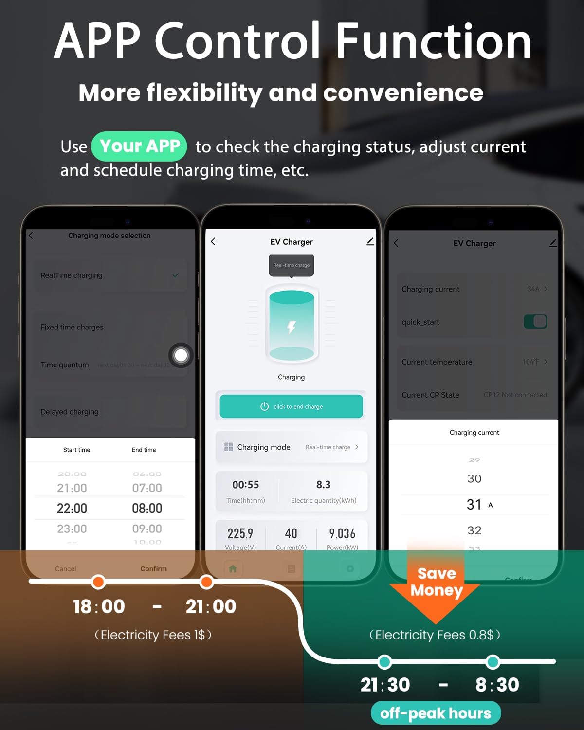 - Intuitive Smart App Control: Monitor and manage your charging sessions remotely with the dedicated app; Connect via Wi-Fi (2.4 GHz) to control charging currents (from 8A to 40A), schedule charging times(fixed time charging and delayed charging), and keep track of your charging status in real-time; Optimize your charging experience for both convenience and energy efficiency