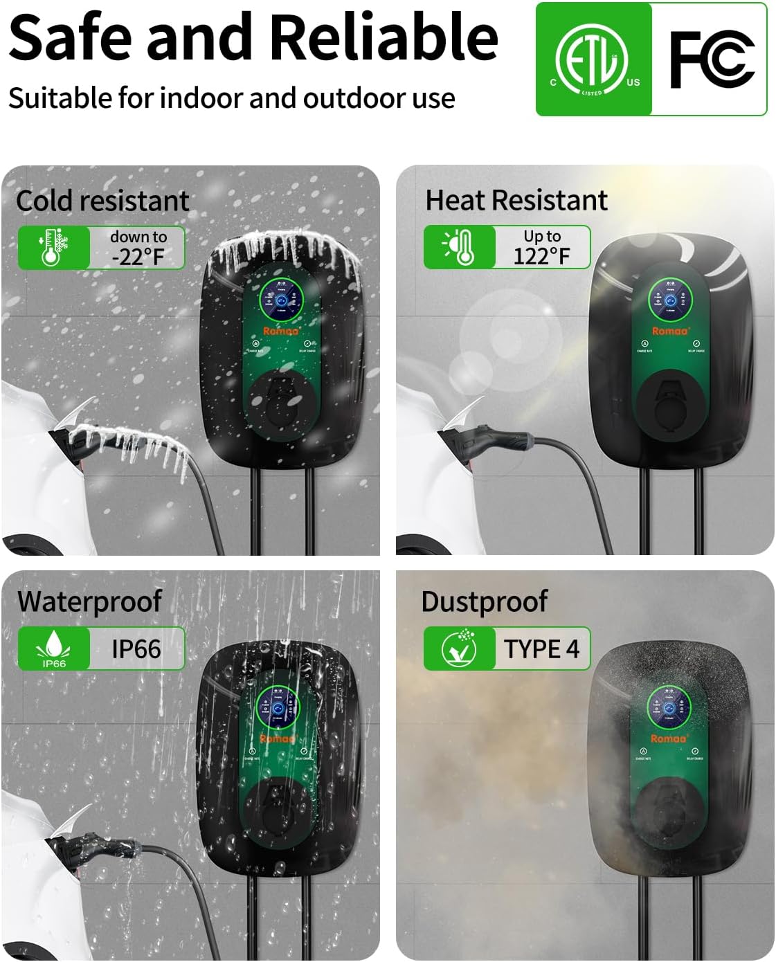 - Universal Compatibility: Equipped with a J1772 plug, this Romaa ev charger compatible with most SAE J1772 charger models, level 2 charger for Ford Mustang Mach-E, Chevy Bolt/Volt, VW ID.4, Hyundai IONIQ 5/6, Kia EV6/EV9, Rivian R1S/R1T, Jeep 4xe and more (Note: Tesla requires an adapter.)