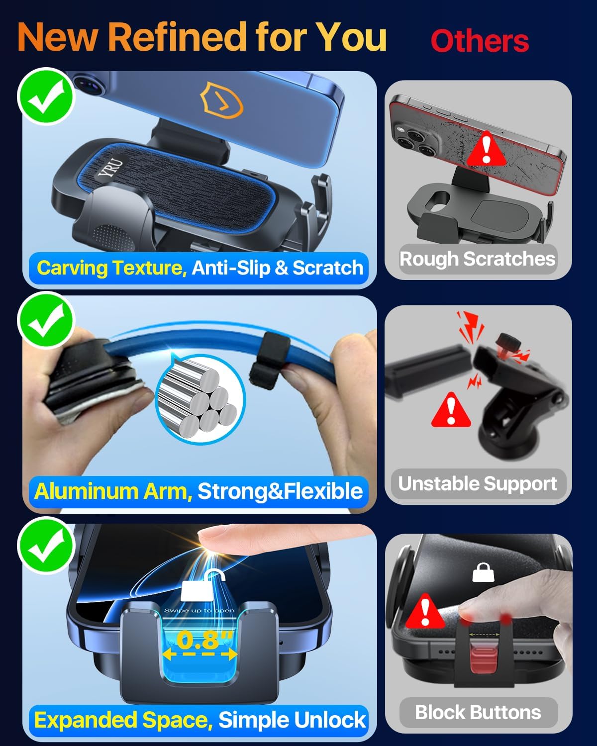 - Sleek Choice-Unique Bendable Alloy Arm, Flexible & Adjustable for Safety Concern: The Perfect Car Partner - YRU Dashboard Phone Holder with aluminum alloy arm can be bent to any angle. More flexible/convenient. Place on the dashboard/windshield or any flat surface to achieve an infinite viewing angle for safety