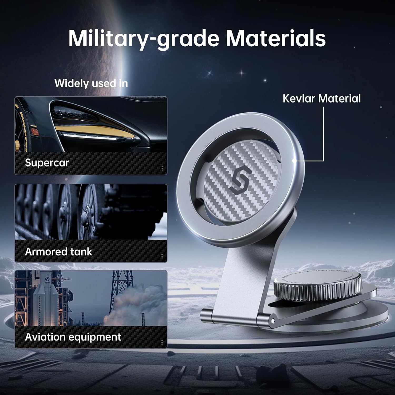 - ă Protective Kevlar MaterialăConstructed from Protective Kevlar material, the panel part of this Magnetic car phone holder combines lightweight design with exceptional durability for reliable performance. The Kevlar construction not only ensures strength but also adds a stylish aesthetic to your vehicle's interior. Note: This car phone mount has magnetic feature but it is NOT a charger. It is MagSafe compatible which meets industry standards and provides the convenience and precision of snap-on attachment with a magnetic ring.