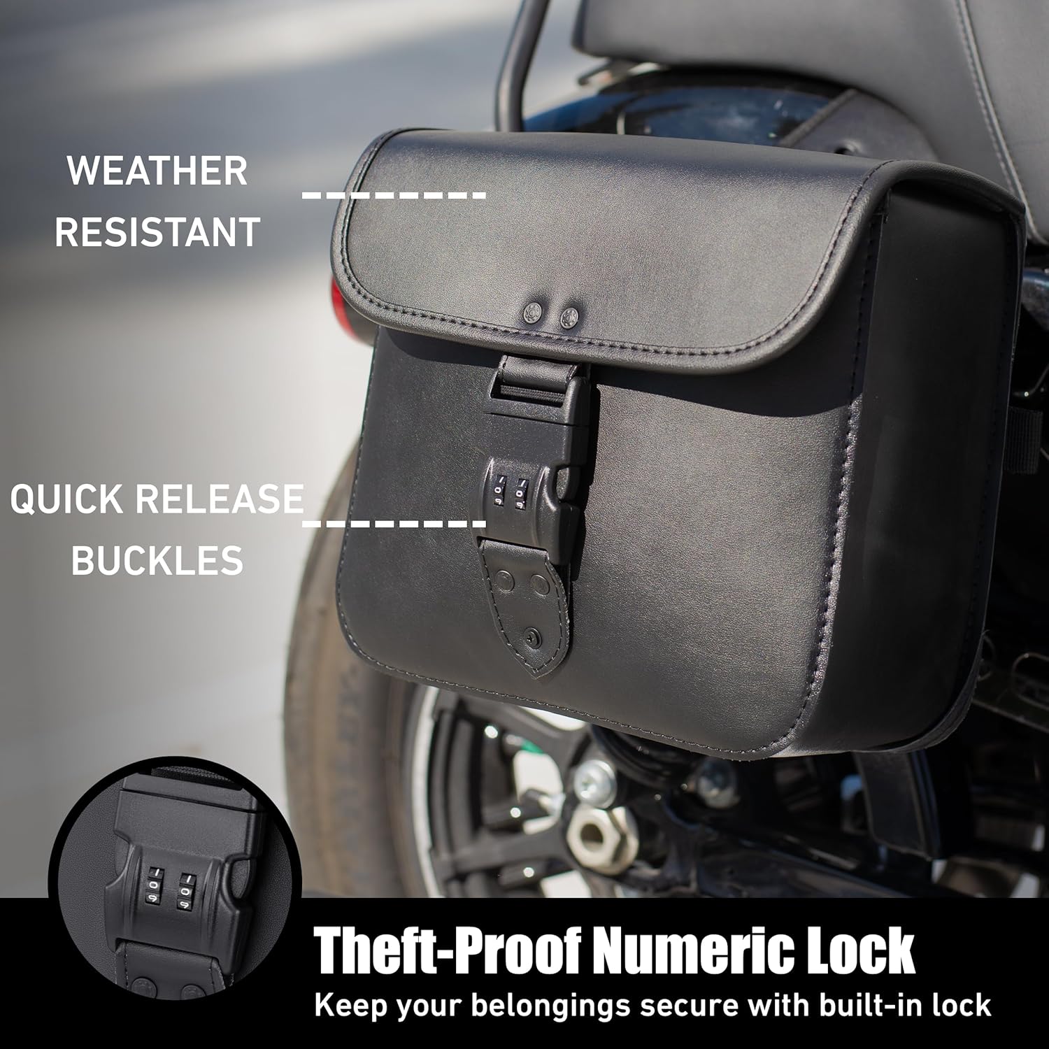 - High-Quality Leather Saddlebag Material: Crafted from premium synthetic leather, these leather motorcycle saddlebags offer a luxurious, sophisticated look that complements your motorcycle's style. The material ensures long-lasting durability against various weather elements. Inside, a plastic liner adds stability, helping the motorcycle riding saddle bags maintain their shape even when fully loaded.