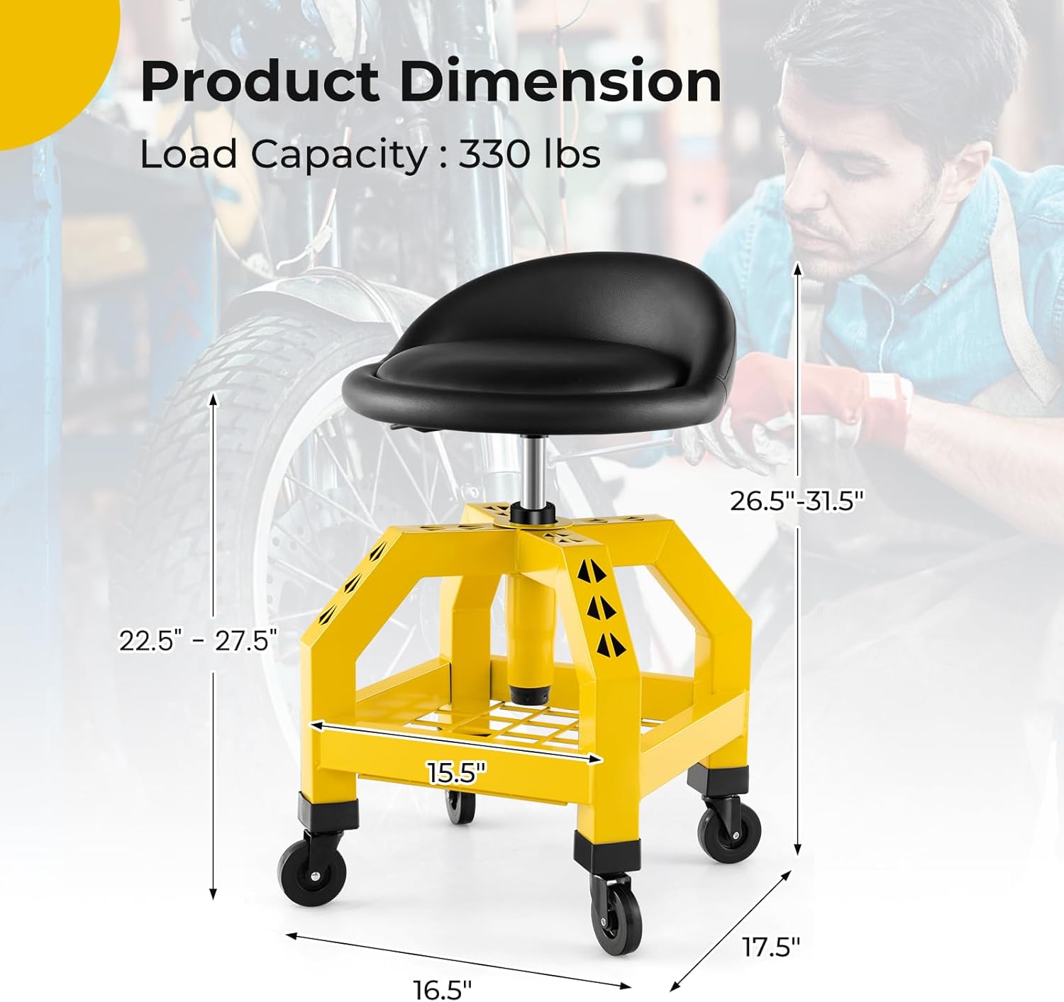 S AFSTAR Shop Stool with Wheels, Height Adjustable Garage Stool with 4 Universal Wheels & Tool Tray, 330 LBS Capacity, Heavy Duty Creeper Chair Seat Rolling Mechanic Stool for Garage Workshop (Yellow)