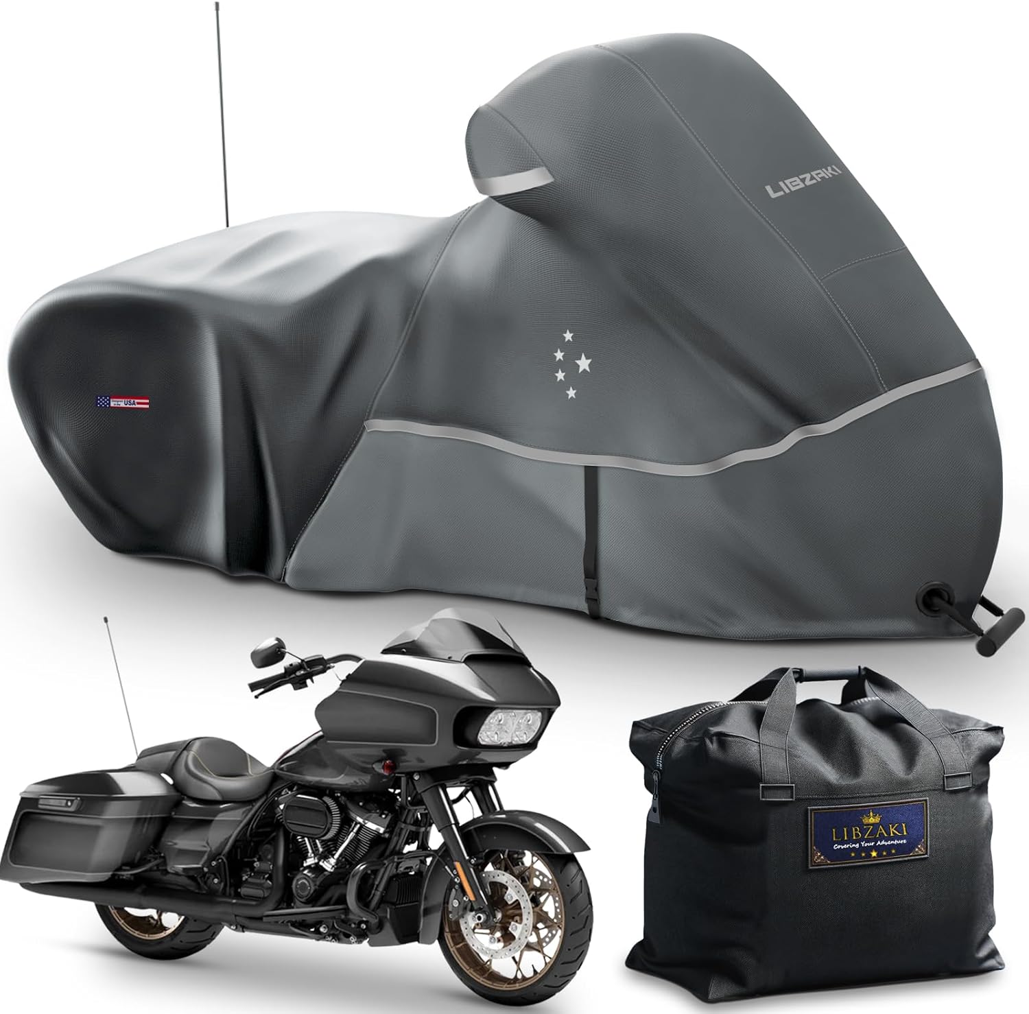 Motorcycle Cover LI LIBZAKI 600D Heavy Duty Storage for Touring Models Harley Davidson Road King,Road Glide,Street Glide, Electra Glide,Heritage Classic,Low Rider-ST,and Most Motorcycles/Gray