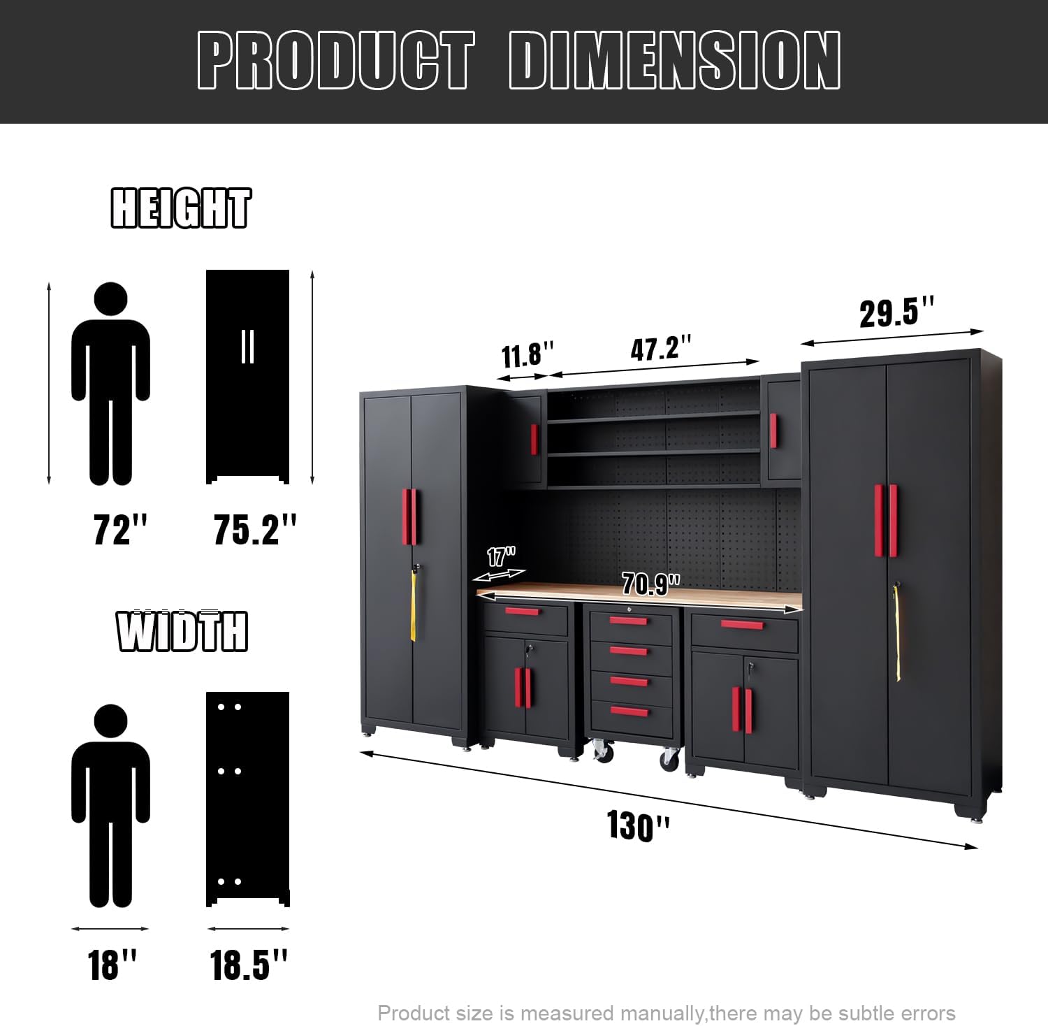 - Specification: Garage storage system includes locker x 2, wall cabinet x 2, 1-drawer cabinet x 2, 4-drawer roller cabinet x 1, 71 in workbench x 1, pegboard x 10, shelf to connect the wall cabinets x 4. Item Weight: 491.5 lbs; Package Size: 45.3 x 33.5 x 79.1 in; Item Size: 130 x 18.5 x 75.2 in; Item Color: Black and Red