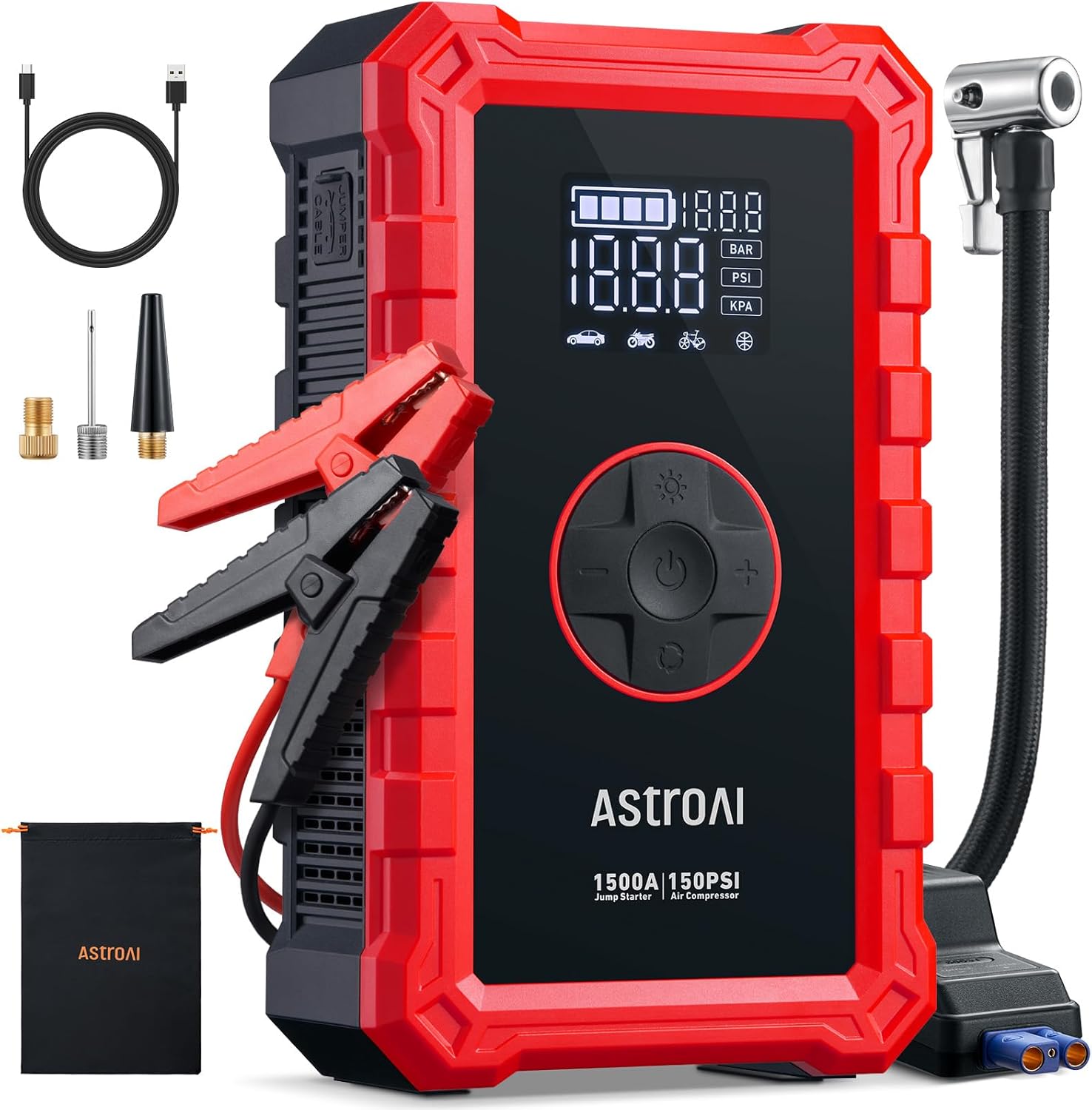 AstroAI S8 Air Jump Starter with Air Compressor, 1500A Peak Car Battery Jump Starter Portable (6.0 Gas/3.0L Diesel) with 150PSI Cordless Auto-Shutoff Tire Inflator, 12V Battery Charger Booster(Red)